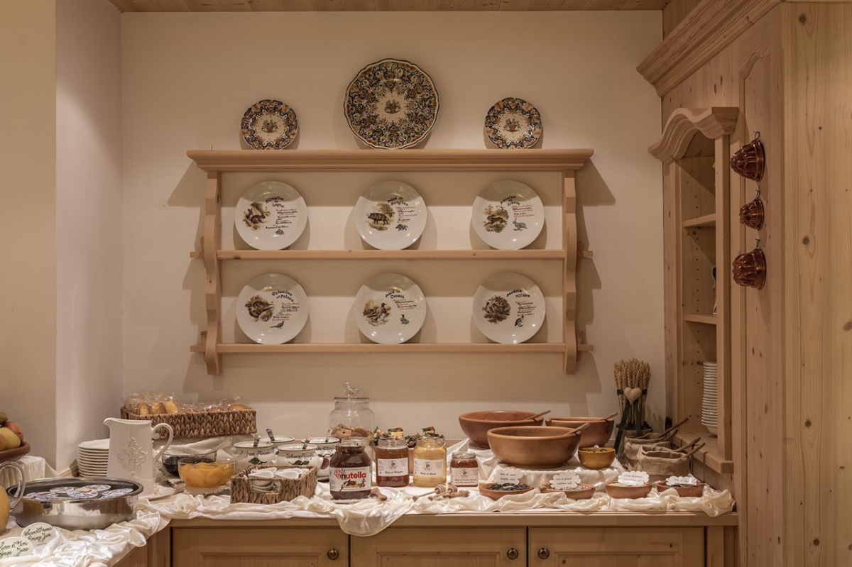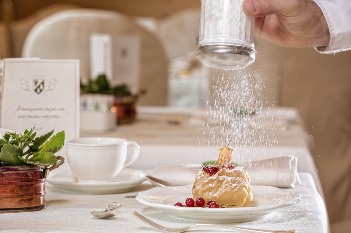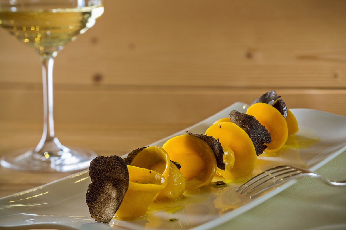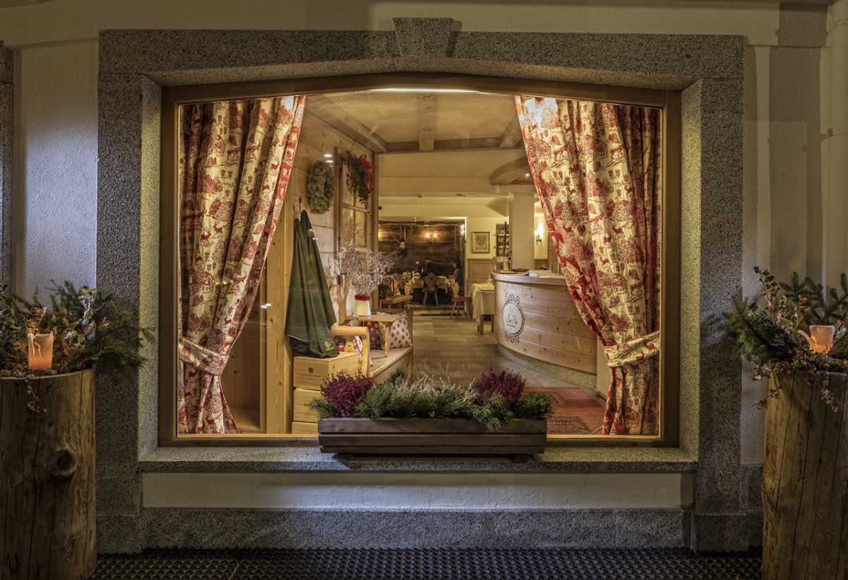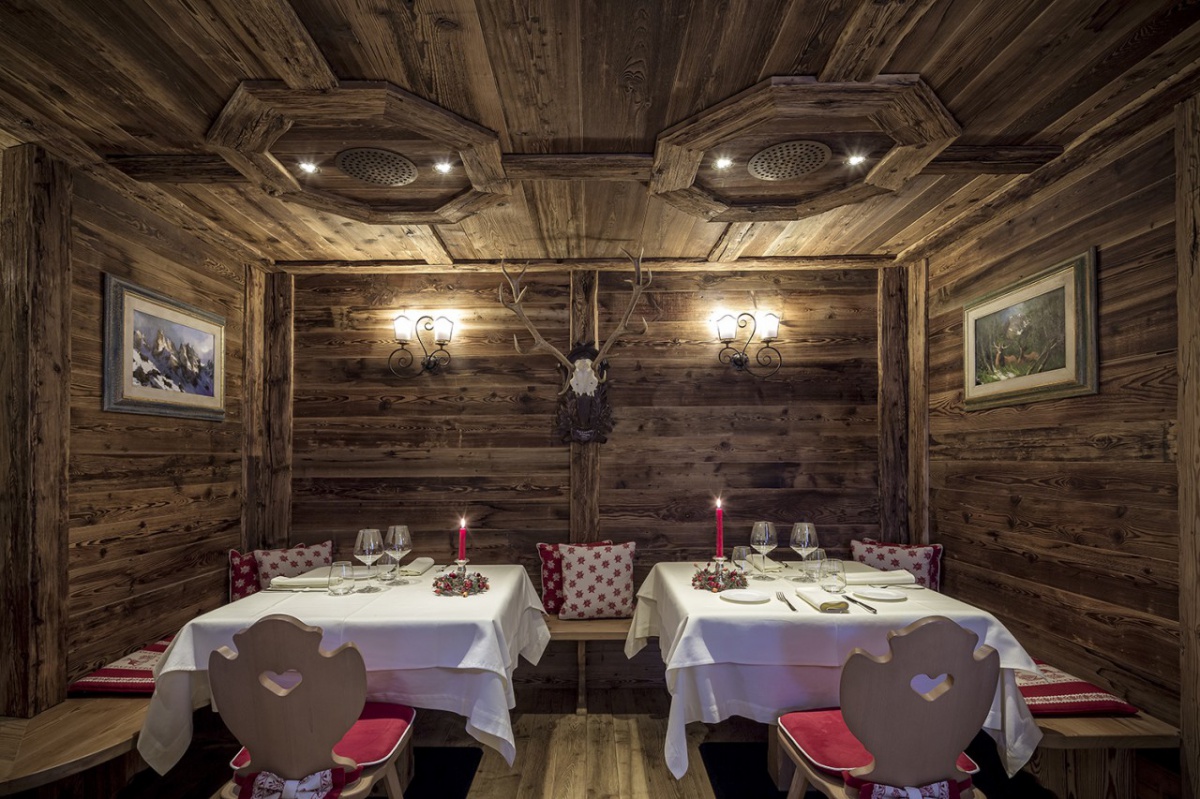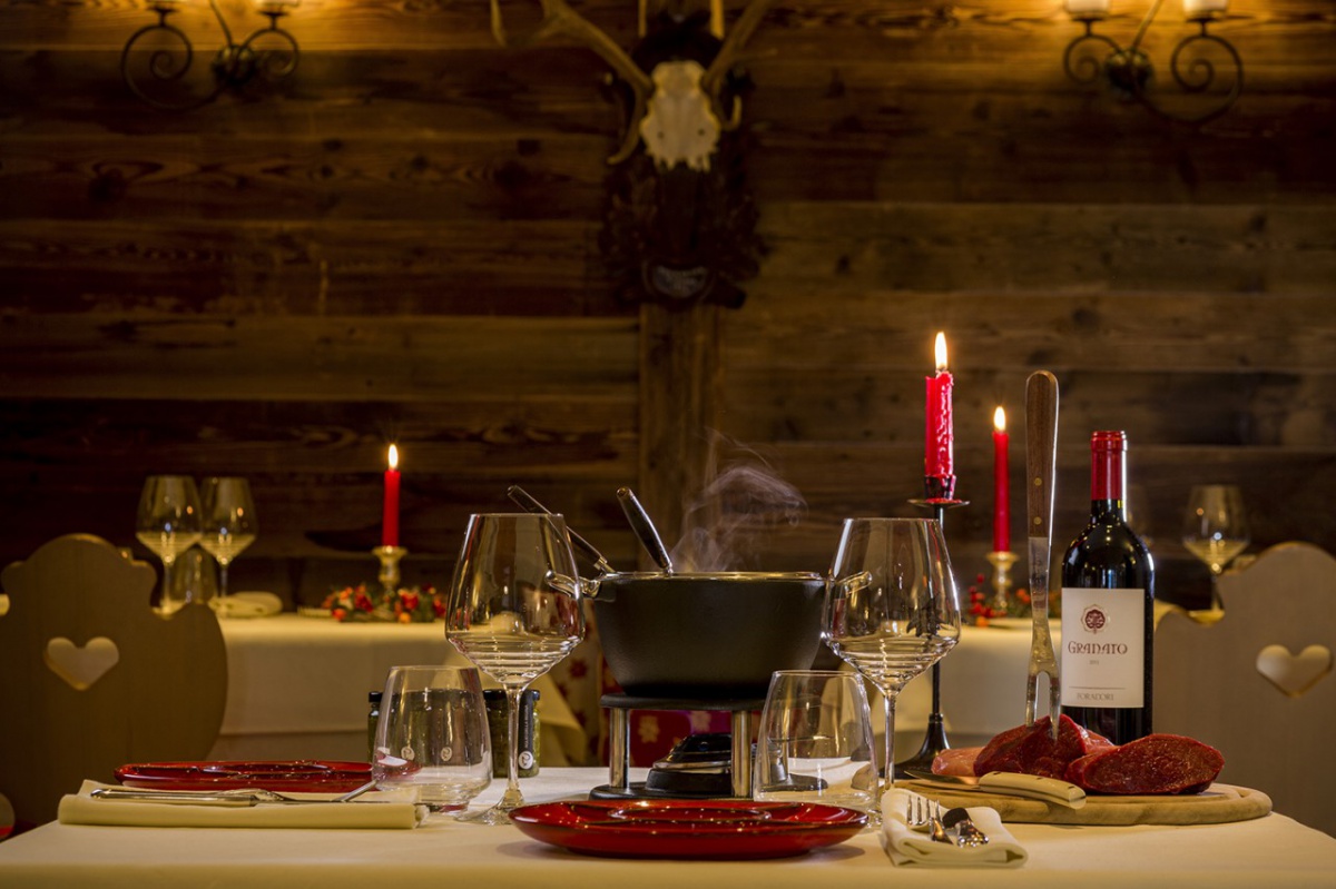 Ексклюзивна кахельна піч, розписана вручну, натуральні матеріали, турбота про освітлення та елегантний штрих у деталях та обстановці надають ресторану Due Pini клас та індивідуальність, типові для гірських закладів. Оточені теплом цієї магічної атмосфери, ви зможете насолоджуватися кухнею, яка дотримується регіональної трентинської традиції, але в той же час переглядається в оригінальному та мудрому ключі, завжди використовуючи добірні місцеві інгредієнти.