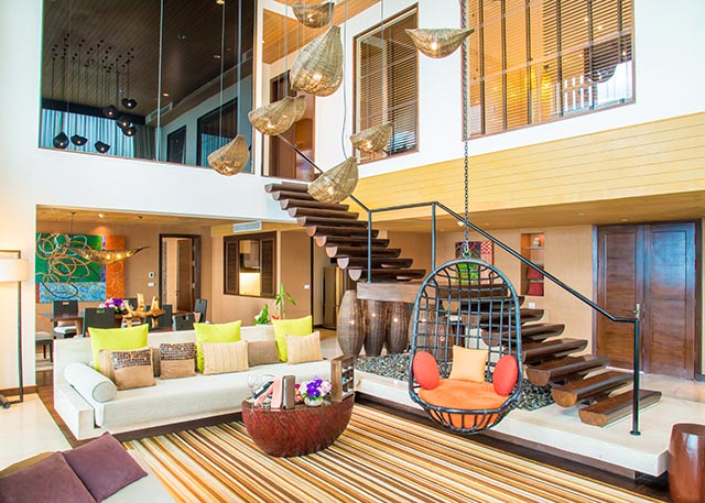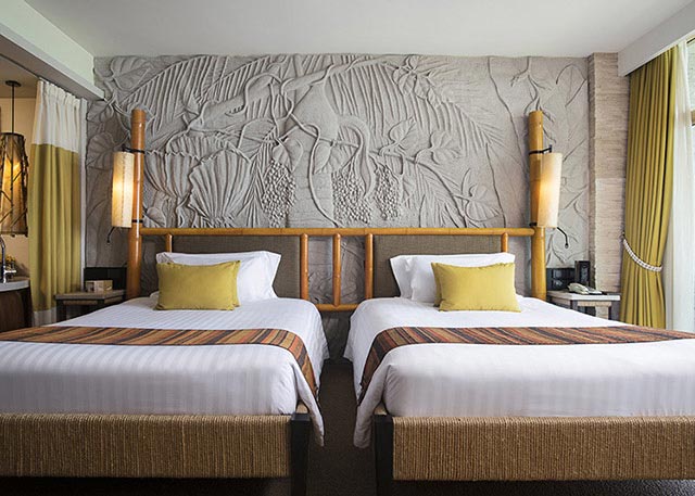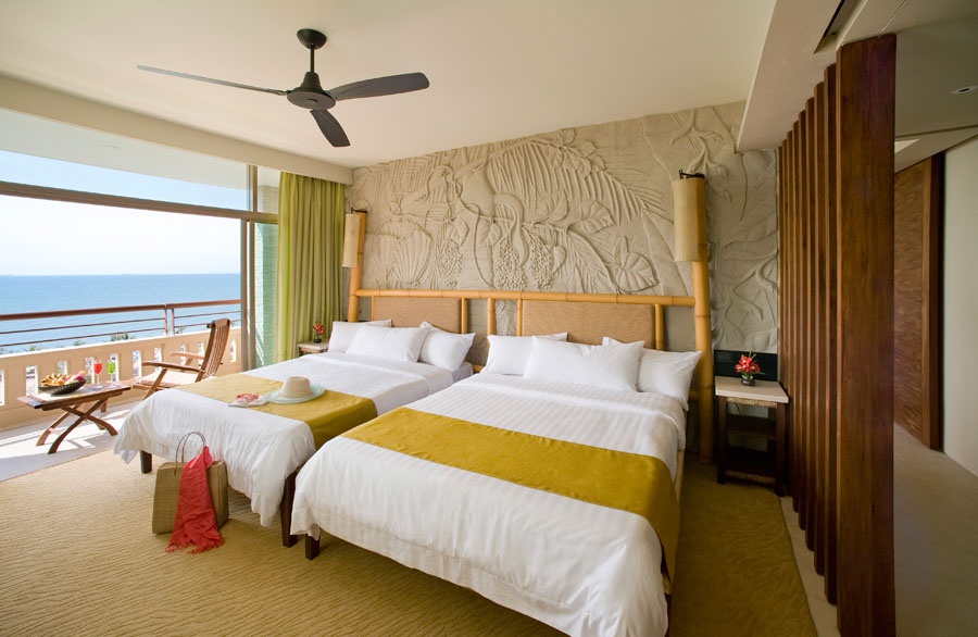 42 кв. м Номер вкрадений барельфами і має Дві спальні з двома ліжками з бамбукові та робочою зоною, посилкою, душовою ванною кімнатою та галькою з видом на океан.Розміщення 2 дорослих і 2 дітей.