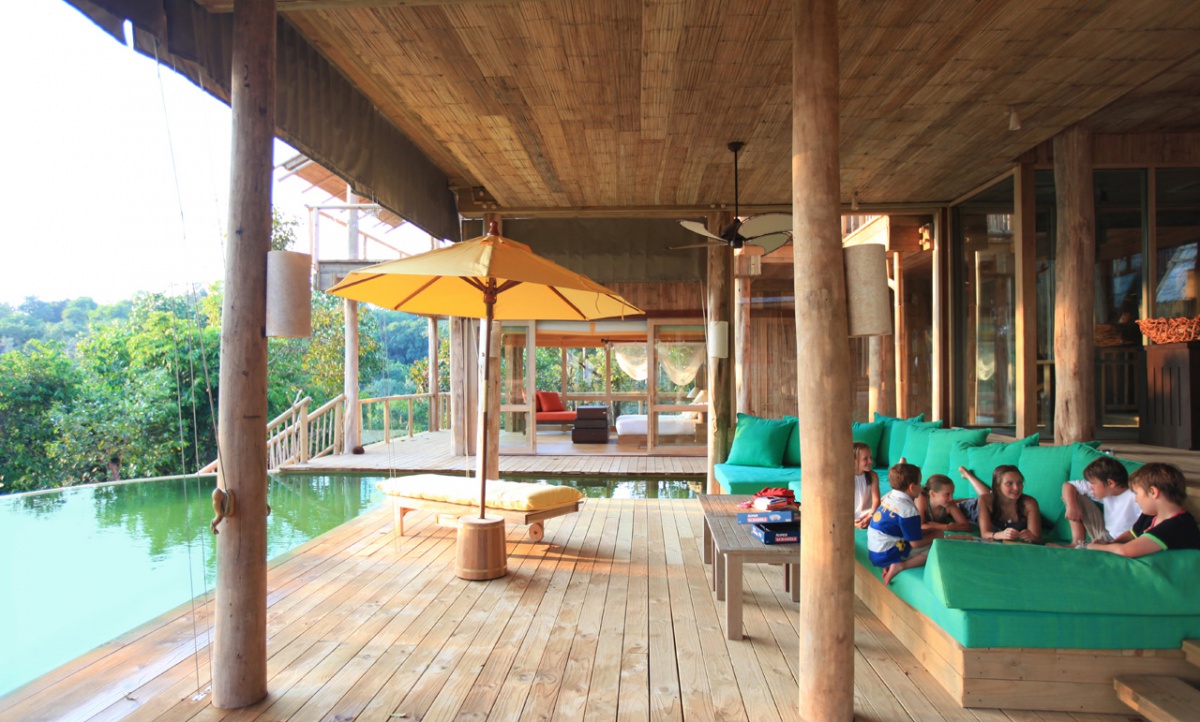 3 Спальня приватний пляж басейн заповідник: 641 м1 час (517 кв.м.1 час - номери і 412 м1 час - Площа басейну. З головної спальні з двоспальним ліжком king-size з відкритим планом і санвузлом, спальнею з ванною кімнатою, вітальнею з повністю обладнаною кухнею, декількома зонами відпочинку і обідньою зоною тераси, ножами і басейном, дерев'яний будинок для двох спальних дітей, шафа для душу. Максимальне розміщення 4 дорослих + 3 дітей.