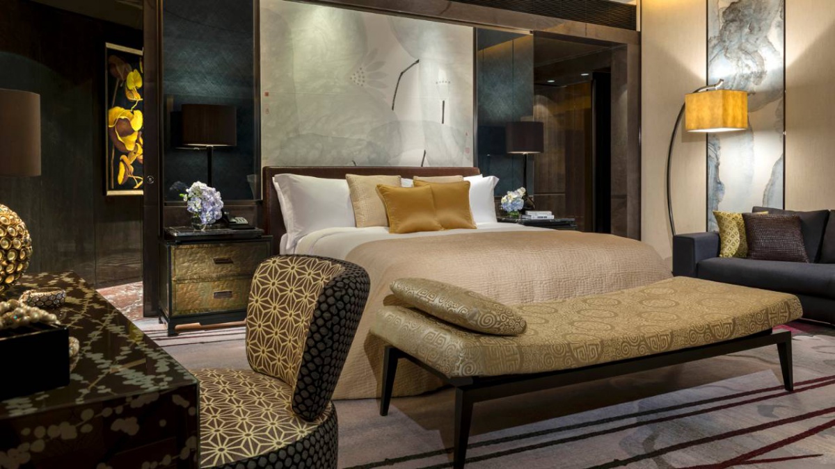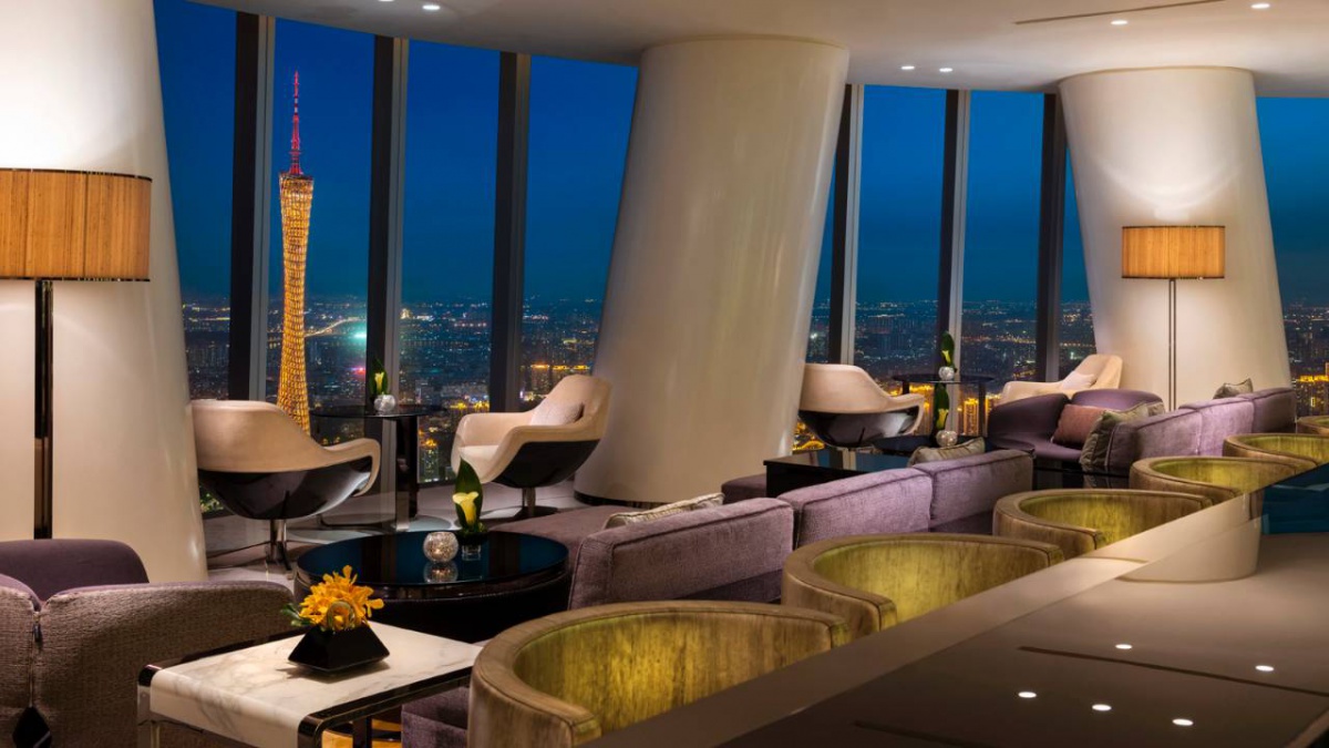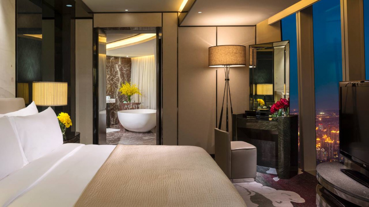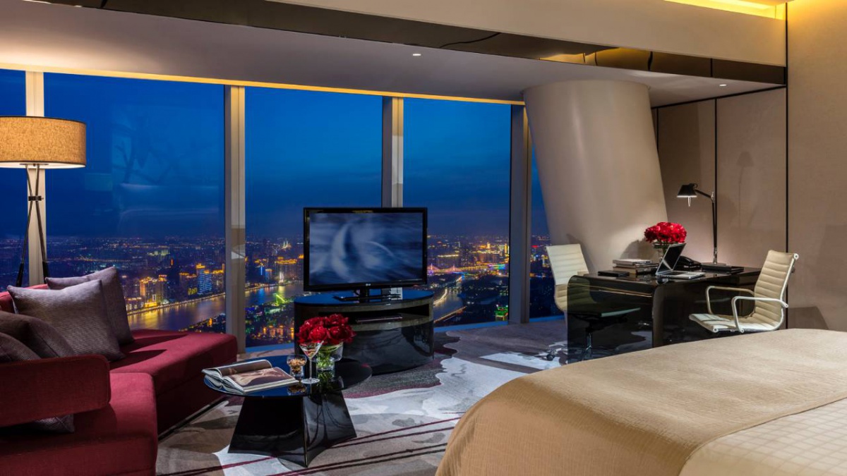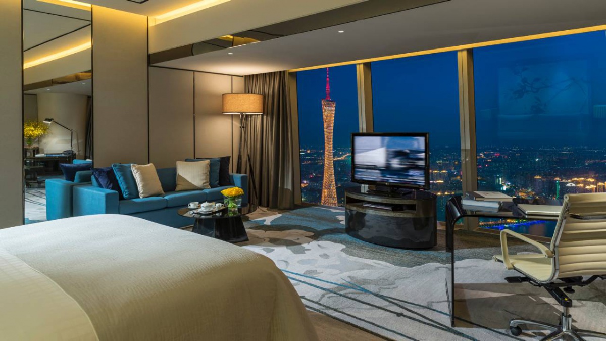 Полулюкс (52 квадратних метрів): спальня з двоспальним ліжком king-size, ванна кімната з ванною та душовою кабіною, з функцією «тропічний дощ». Від 93 до 98 поверху. Це панорамний вид Гуанчжоу.