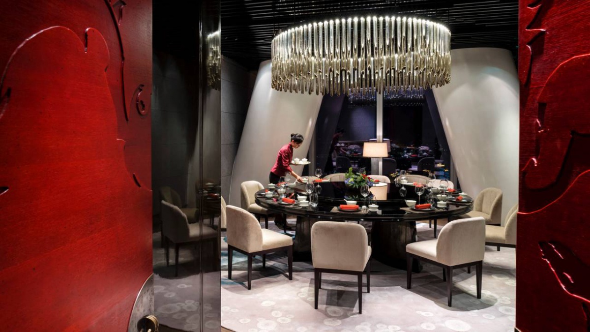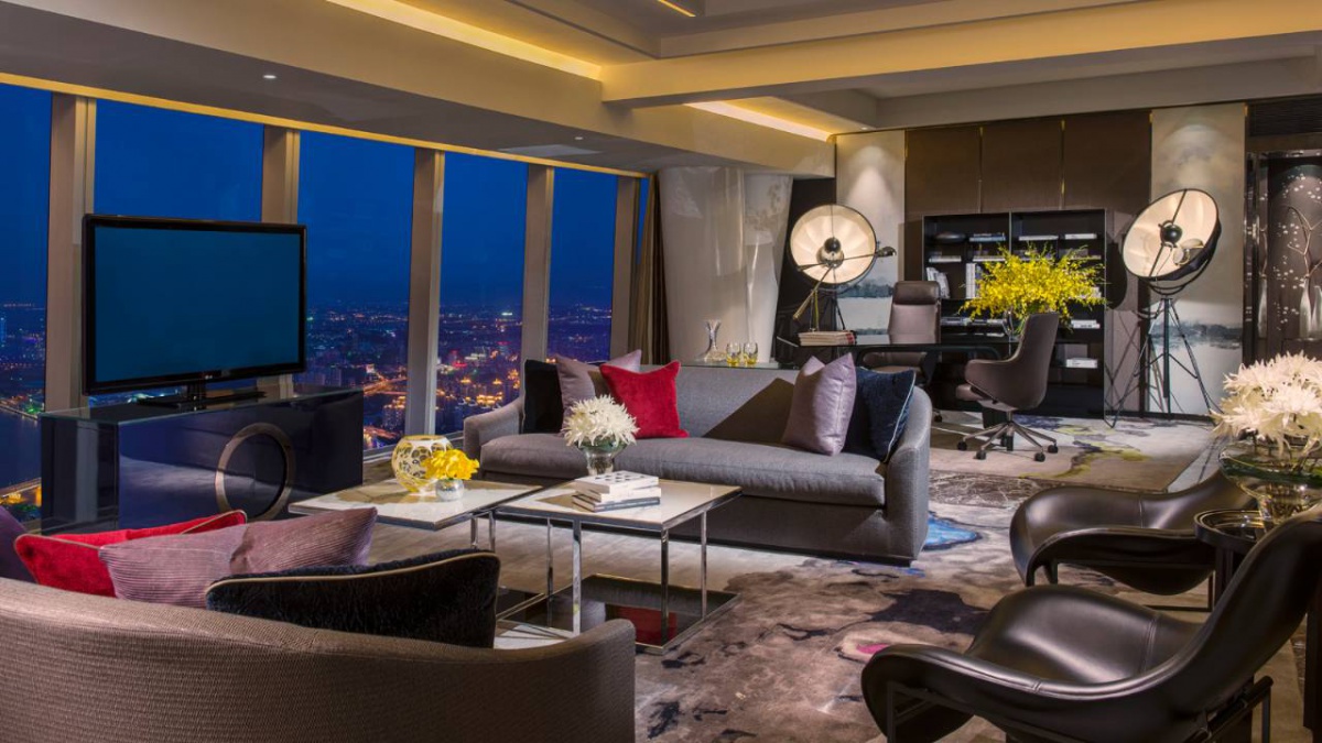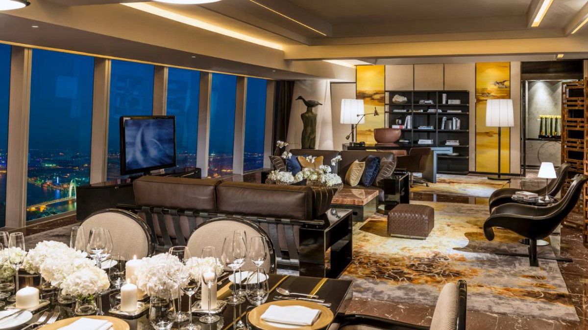 Полулюкс (253 кв. м): їдальня (6-особистий столик), кімната для зберігання, 2 спальні (одна з двоспальним ліжком king-size, два з двома окремими ліжками), 2 шафи, 2 санвузли (все з ванною та душовою кабіною з " лоток " функція). На 96 поверсі. Це панорамний вид Гуанчжоу.