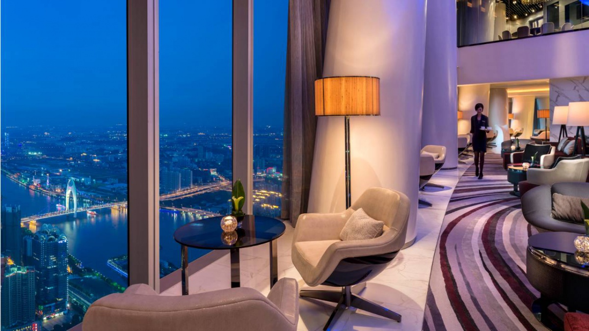 Полулюкс (61 квадратних метрів): спальня з двоспальним ліжком king-size або двома двоспальними ліжками, ванна кімната з ванною та душовим кабелем з функцією " trout Rain " . З 74 до 95 поверхів. Це панорамний вид Гуанчжоу.