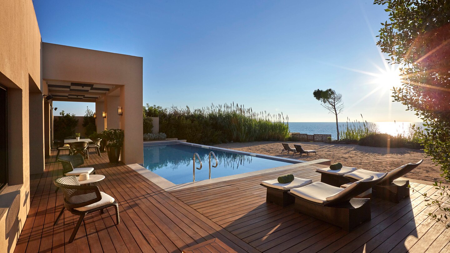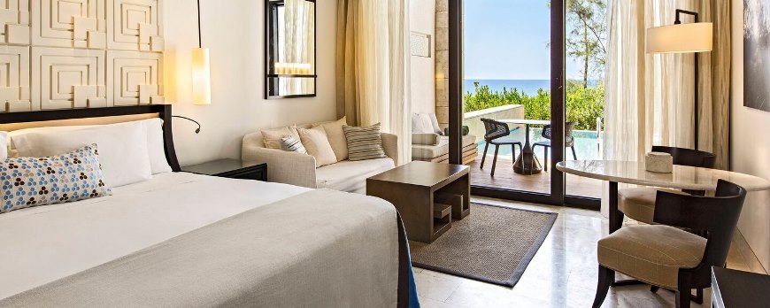 43 кв. м. Інтер'єр номера виконаний у приємній палітрі вишуканих темно-коричневих та пісочних відтінків. Номер має спальню з ліжком розміру «king-size» та куточком для відпочинку, ванною кімнатою з ванною та душем, мебльованою терасою з приватним басейном (23 кв. м.) та панорамним видом на море. Доступне бронювання дитячого ліжка. Розміщення: 3 особи.