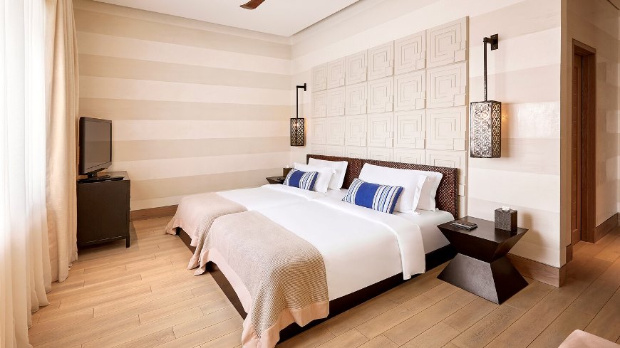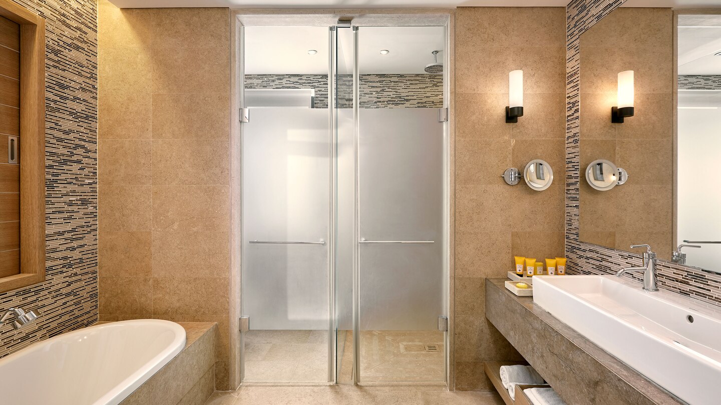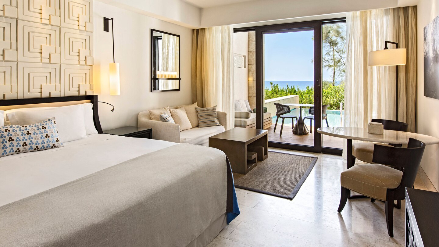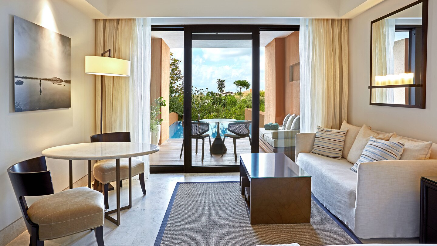 43 кв. м. Номер, виконаний у пастельних пісочно-сірих тонах, оброблений мармуром кремових відтінків та темним деревом, складається зі спальні з двома односпальними ліжками та куточку для відпочинку, ванної кімнати з ванною та душем, мебльованої тераси з басейном (23 кв. м.) та видом на сад. Доступне бронювання дитячого ліжка. Розміщення: 3 особи.