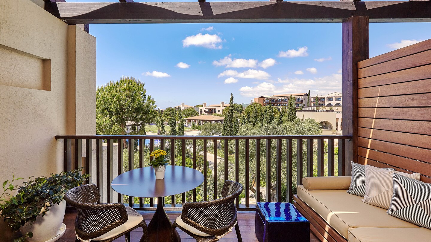 43 кв. м. Номер виконаний у теплих пастельних тонах, оздоблений мармуром кремових відтінків і темним деревом, складається зі спальні з двома односпальними ліжками та куточка для відпочинку, ванної кімнати з ванною та душем, мебльованого балкона з видом на сад та оливковий гай. Доступне бронювання дитячого ліжка. Розміщення: 3 особи.
