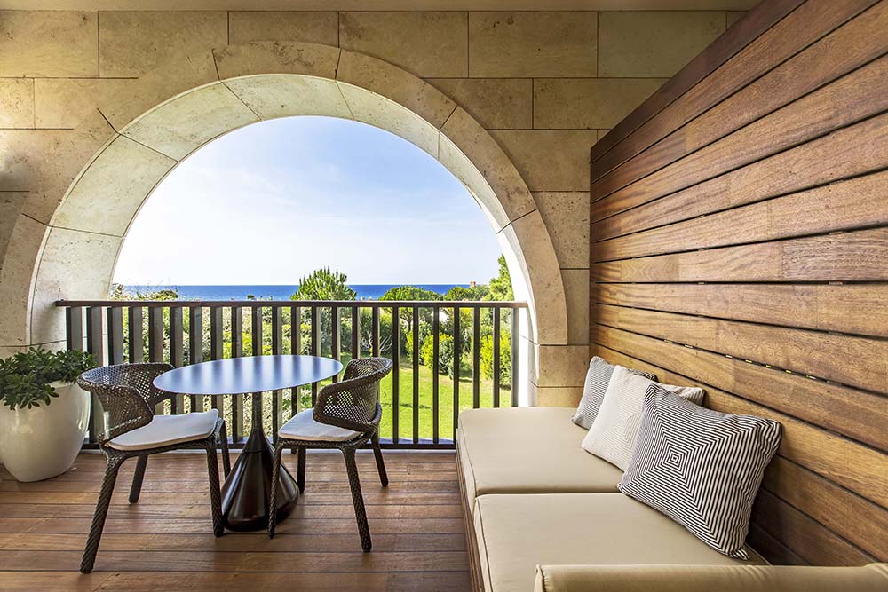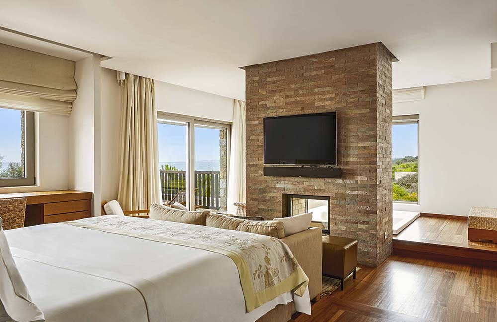 43 кв. м. Вишуканий номер має панорамні скляні двері від підлоги до стелі, що ведуть на простору терасу з якої відкривається вид на Іонічне море і поле для гольфу. Номер складається зі спальні з двоспальним ліжком та куточку для відпочинку, ванної кімнати з ванною та душем. Доступне бронювання дитячого ліжка. Розміщення: 3 особи.