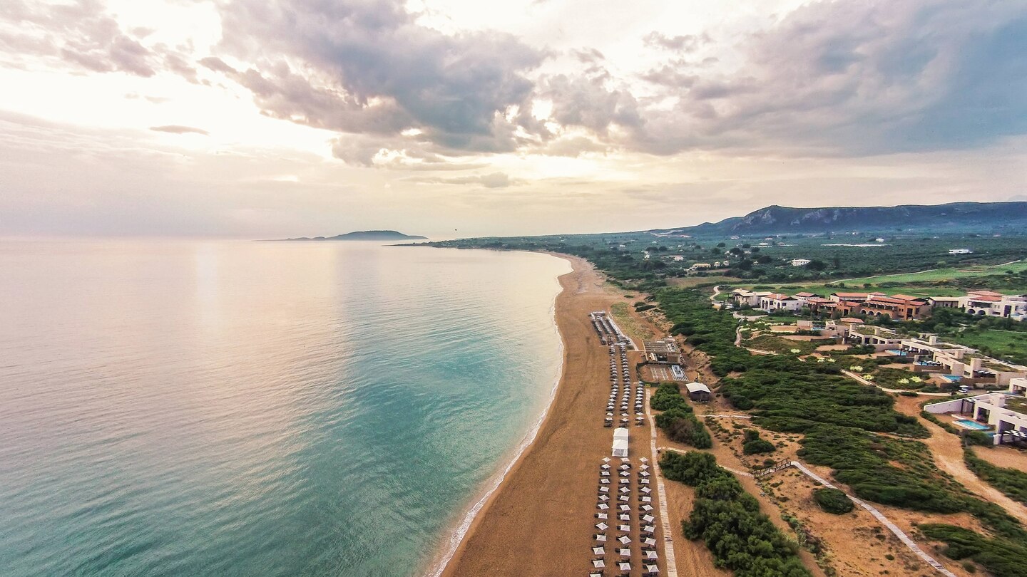 Тут затоки, гори та перлинні піщані пляжі створюють мальовничий пейзаж, в який гармонійно вписаний п'ятизірковий готель The Romanos, побудований у стилі давньогрецького палацу, натхненний знаменитими палацами Мессінії.