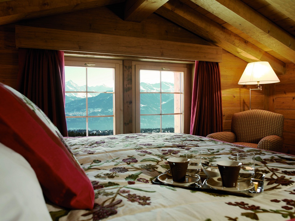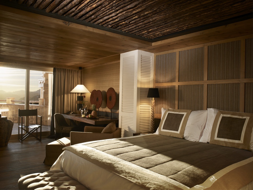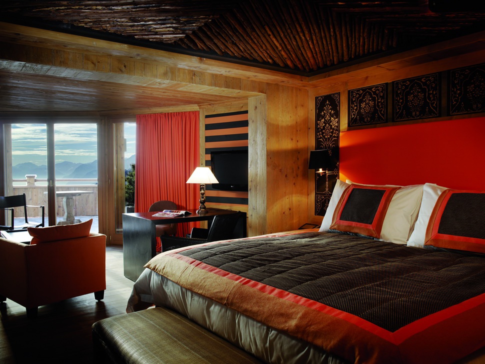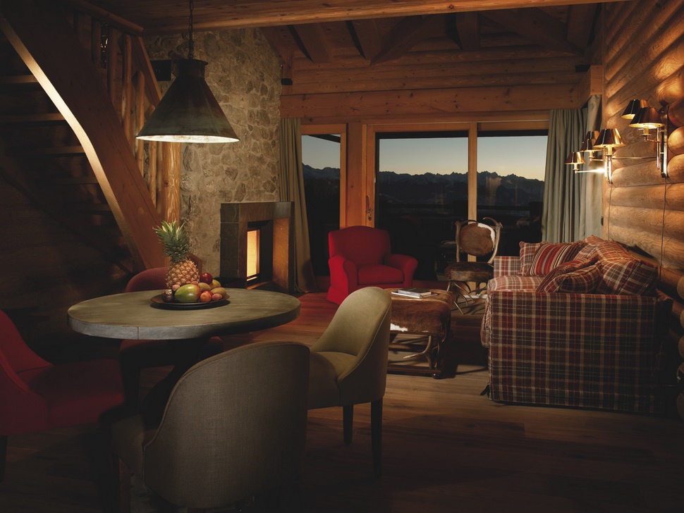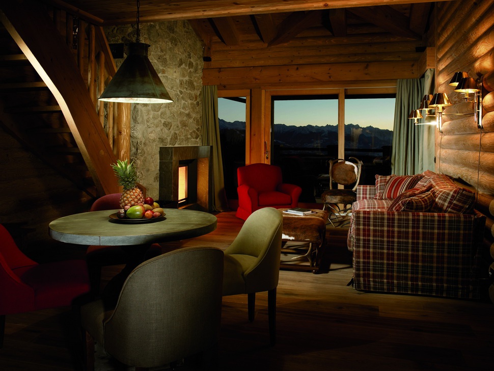 Люкс Alpes Deluxe: 70 кв.м. блискучий дворівневий номер в традиційному альпійському стилі, відокремлений від основного дерева 150 років і дорогих тканин в зелених, червоних і кремових тонах. Складається з вітальні, спальні (на 2-му поверсі), ванної кімнати, тераси з захоплюючим видом на вершину долини.