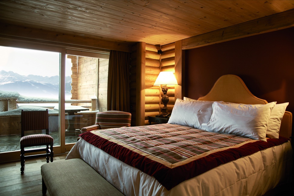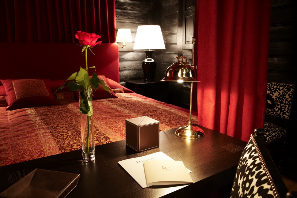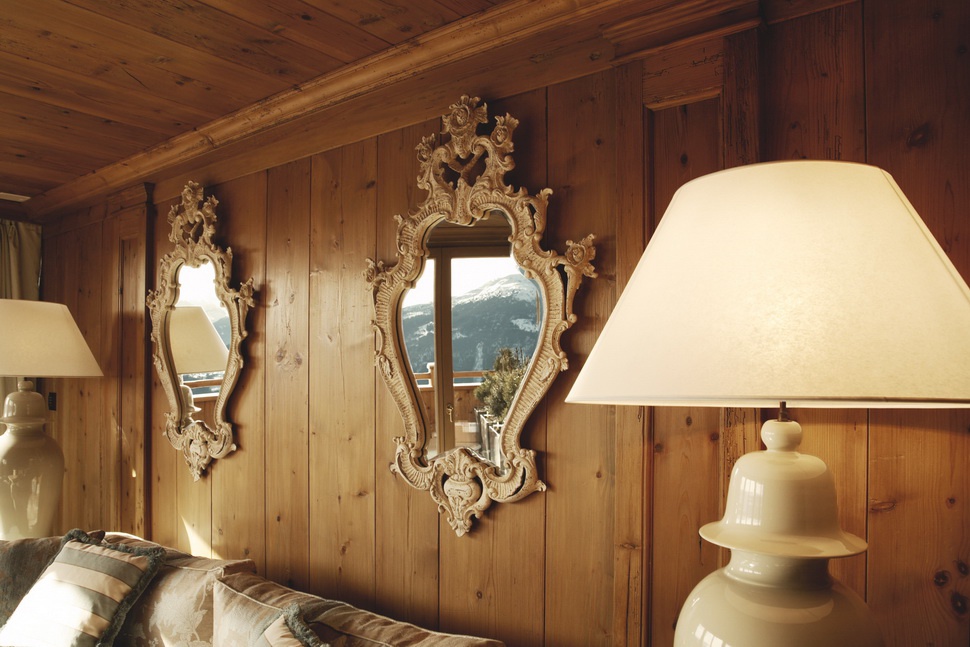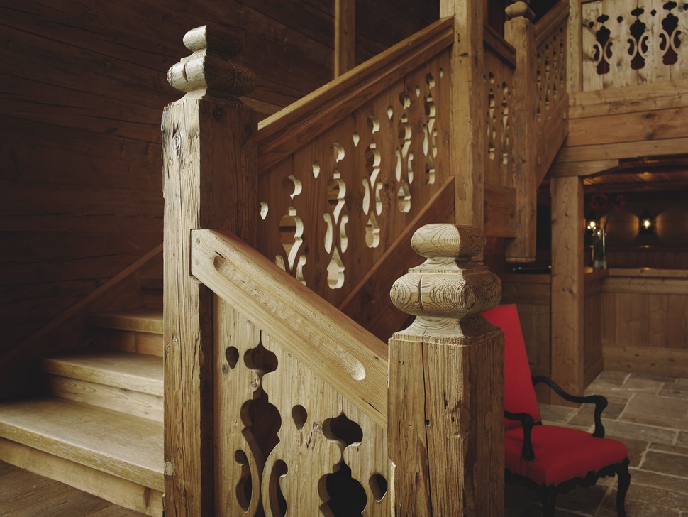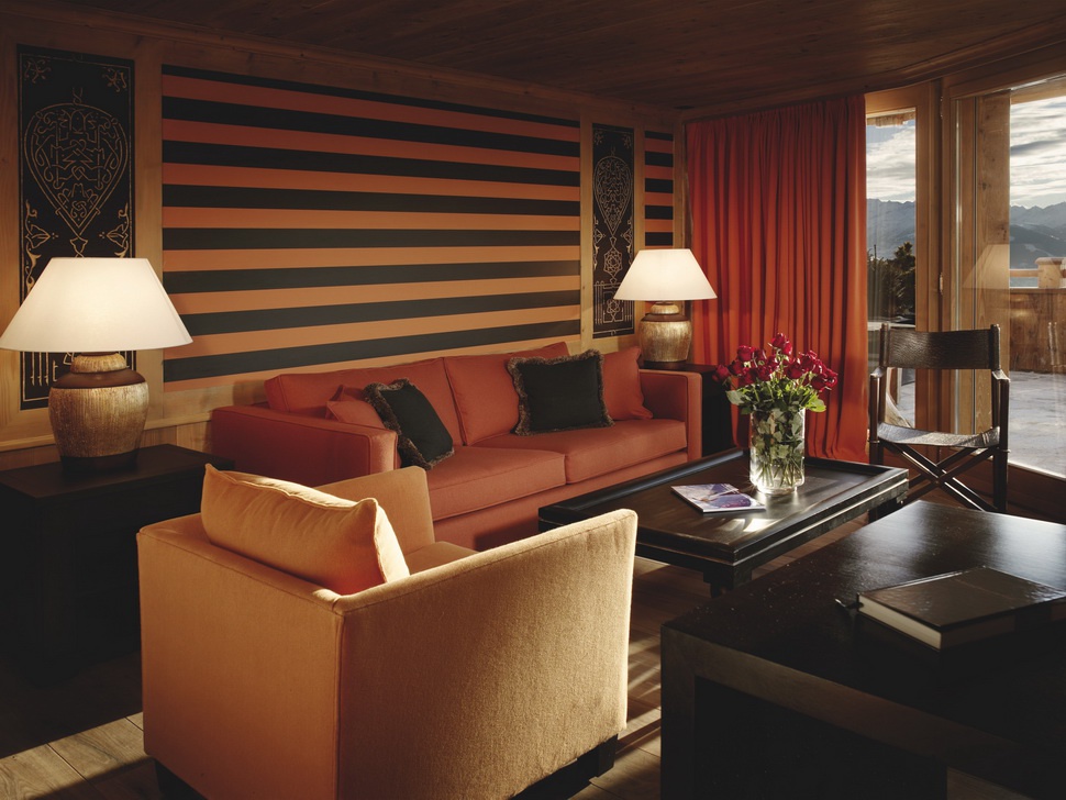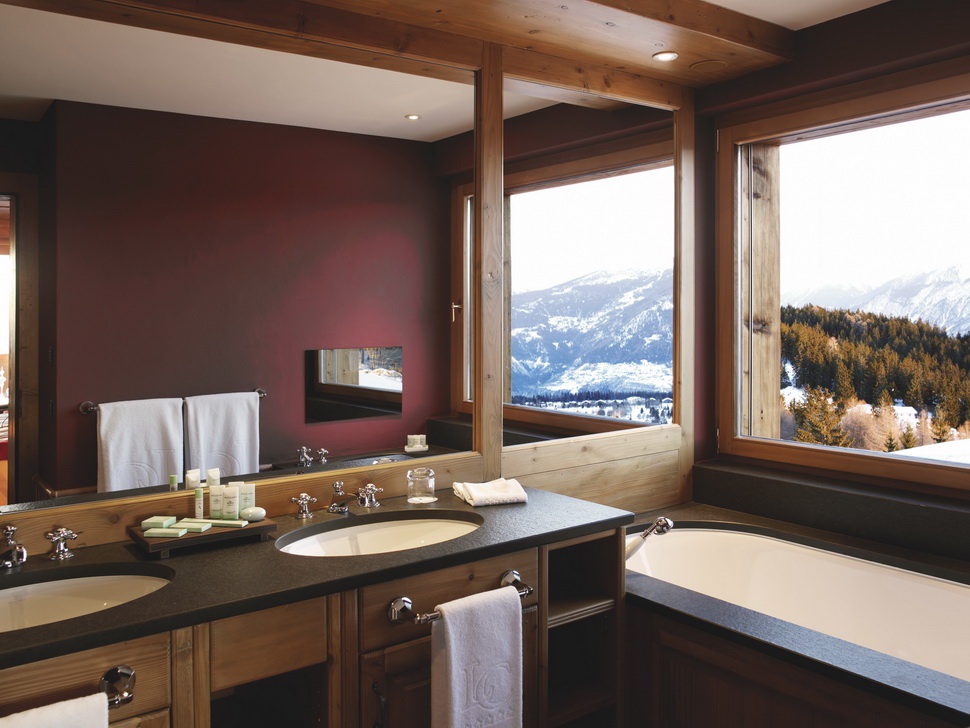 Люкс Alpes Deluxe: 70 кв.м. блискучий дворівневий номер в традиційному альпійському стилі, відокремлений від основного дерева 150 років і дорогих тканин в зелених, червоних і кремових тонах. Складається з вітальні, спальні (на 2-му поверсі), ванної кімнати, тераси з захоплюючим видом на вершину долини.