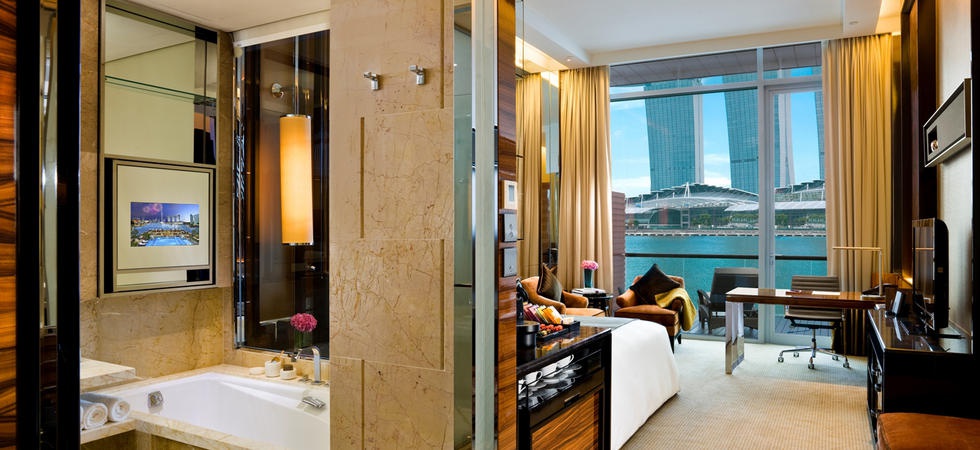 Premier Bay View Room з джакузі: складається з спальні, ванної кімнати, джакузі, тераси, а також вид на океанські хмарочоси та затока Марини Бей.