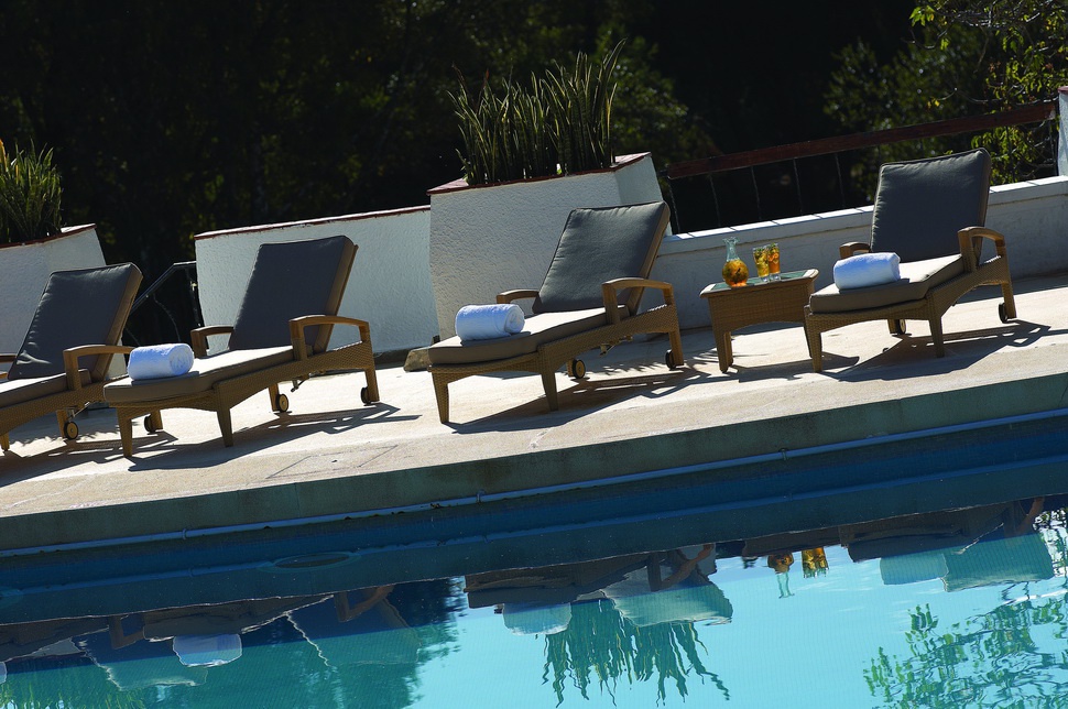Посаджена справа біля басейну. Сковороди, коктейлі, чай, кава і