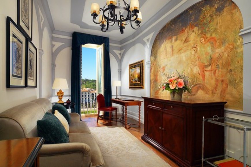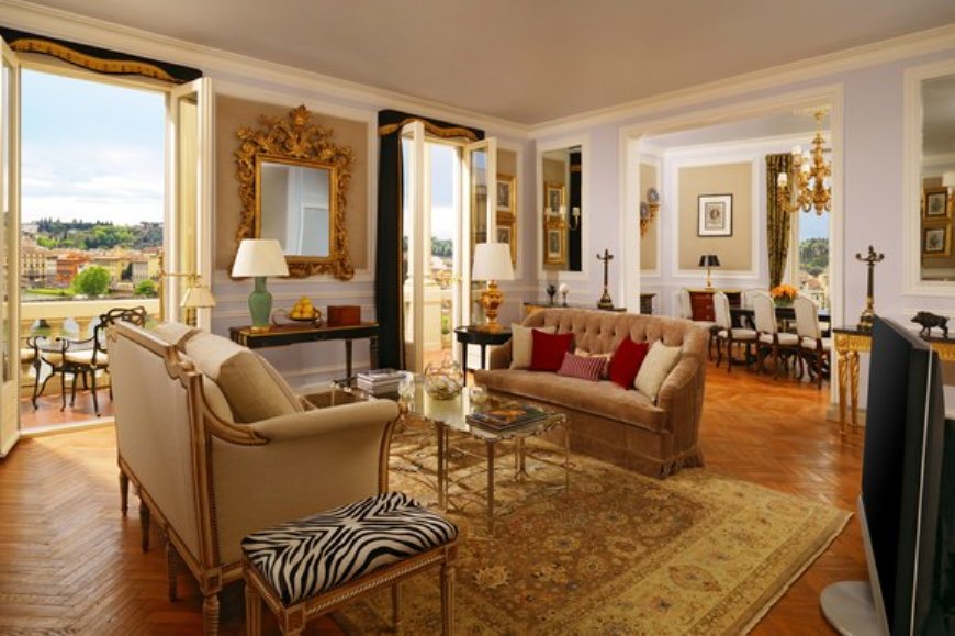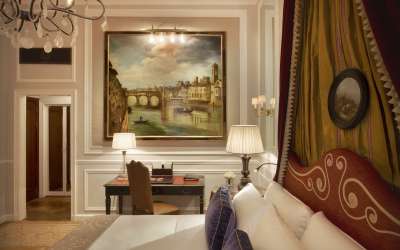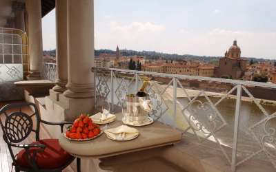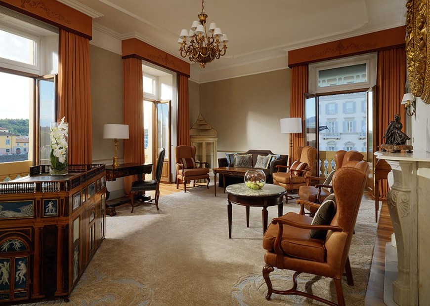 90-100 кв. м. Просторий люкс з витонченими інтер'єром має вишукані шкіряні меблі, новозеландські килими та дерев'яні підлоги. Номер має окрему спальню з ліжком розміру «king-size», вітальню з каміном та диван-ліжком, їдальню з обіднім столом на вісім персон, мармурову ванну кімнату з глибокою ванною, окремий душ і подвійну раковину, великий мебльований балкон з видом на річку Арно. Доступно бронювання додаткового спального місця та дитячого ліжка. Максимальне розміщення – 3 особи.
