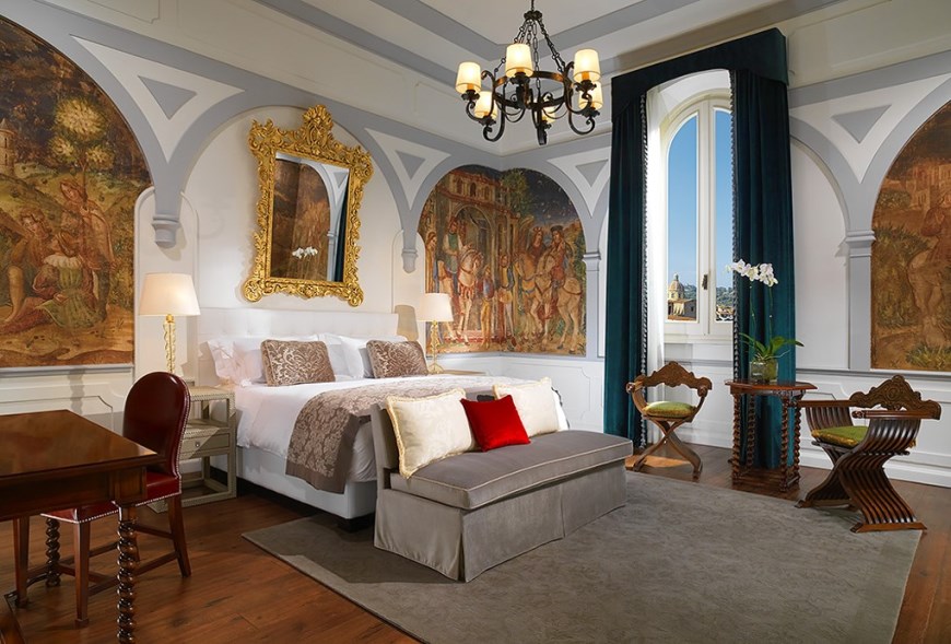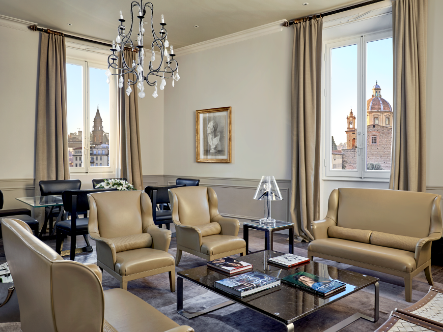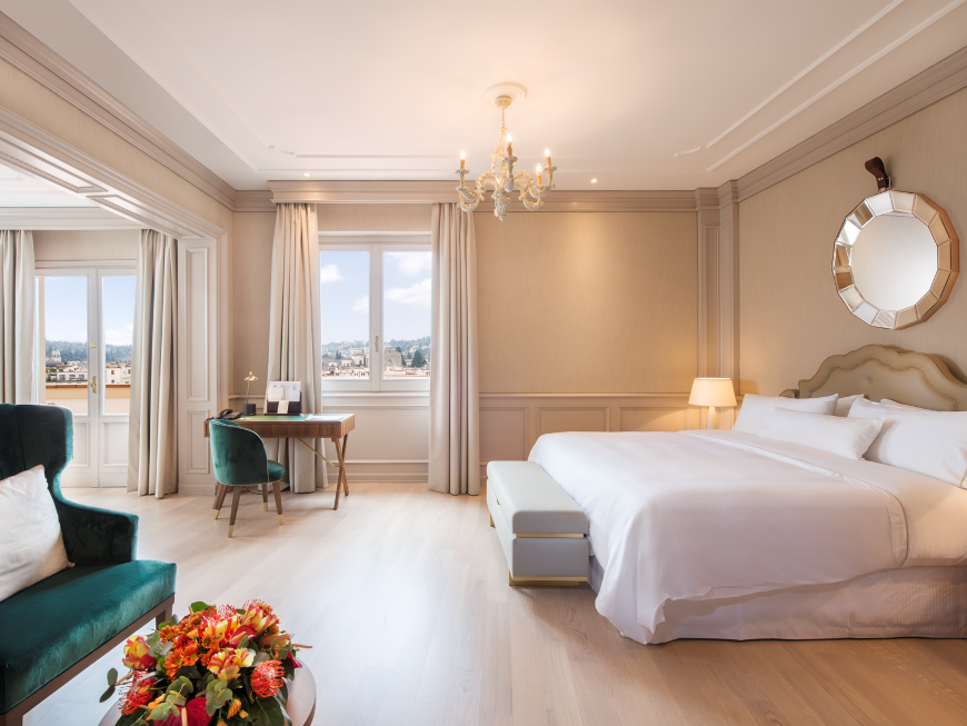 200 кв. м. Розкішний номер, розташований у фронтальній частині палацу, виконаний у стилі Медічі, прикрашений антикварними витворами мистецтва та обставлений вишуканими меблями. Люкс має в своєму розпорядженні простору спальню обладнану ліжком розміру «king-size», окрему вітальню з обідньою зоною, що вміщує до 8 осіб і зоною для відпочинку, гардеробну, ванну кімнату з італійського мармуру з глибокою ванною, подвійною раковиною та окремим душем, балкон з чудовим видом на річку Арно і Флоренцію. Доступне поєднання з додатковою спальнею, бронювання розкладного ліжка та дитячого ліжка. Максимальне розміщення – 3 особи.
