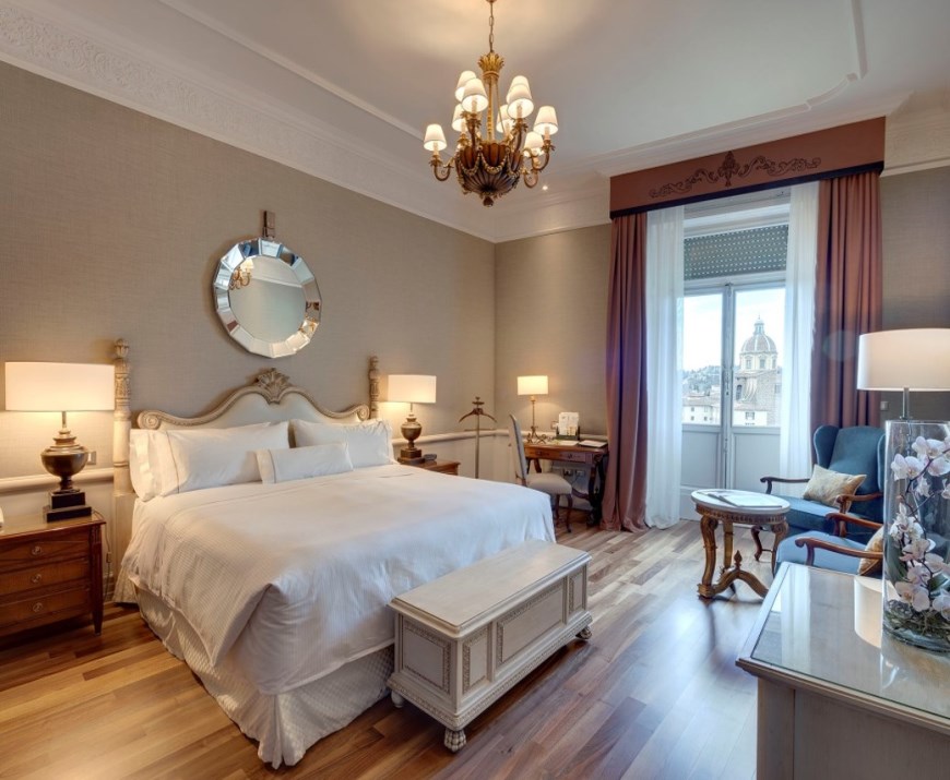 У серці італійської «колиски Відродження» – Флоренції, у старовинному палаці XV століття, що раніше належав знатній родині Джунтіні, розмістився один із найкращих готелів Європи – розкішний St. Regis Florence. До кінця 18 століття в період загальноміського архітектурного оновлення міста палац був перетворений на готель під назвою Гранд Готель Роял де ла Пе. З 1982 року історичний центр Флоренції входить до списку Всесвітньої спадщини ЮНЕСКО, готель є невід'ємною частиною великого міста – його «квітучого» минулого, а саме так перекладається слово Флоренція та інтегрованої в сучасність інфраструктурної досконалості та сервісу. Поглядам гостей, що зупинилися в готелі, будуть представлені чудові фрески ручної роботи, блискучі кришталеві люстри, дзеркала в золочених рамах, справжні витвори мистецтва, старовинні полотна, які прикрашають всі приміщення готелю, включаючи чудові номери та сьюти. Також готель має в своєму розпорядженні СПА Iridium Suites by Clarins, сучасний фітнес-центр, ресторан тосканської кухні, бар, винний погреб з багатою колекцією вин, зали для ділових і урочистих зустрічей, а також інші послуги найвищого рівня.