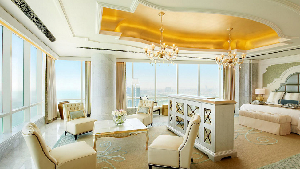 1085 кв. м, двоповерховий номер. Окремий ліфт із холу. Розташований усередині мосту між вежами на 48 та 49 поверсі. Панорамний вид на затоку.