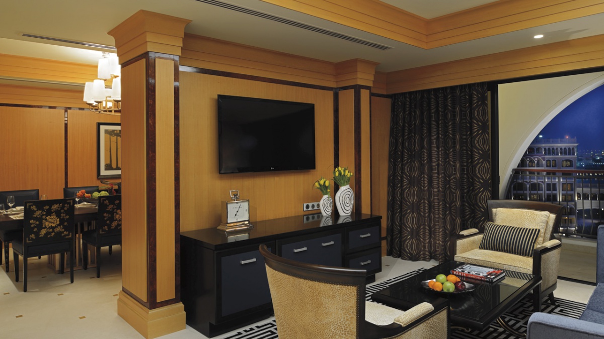 Venetian Two Bedroom Suite: 120 м2. Розташований у венеціанському селі на 1 або 2 поверсі, включає 2 спальні (з ліжком king-size та двома ліжками double), вітальню, ванну кімнату, балкон, більшість номерів з видом на венеціанське село або пляж.