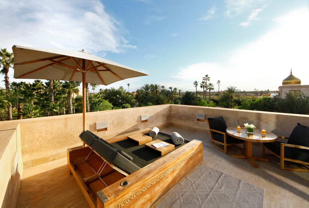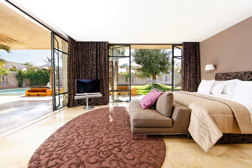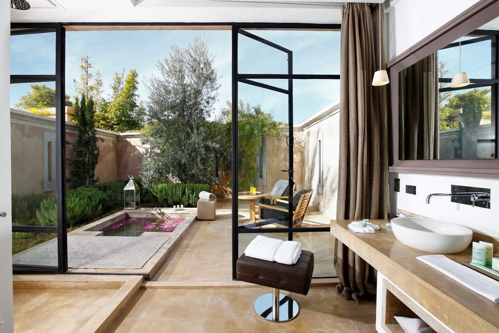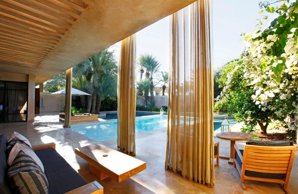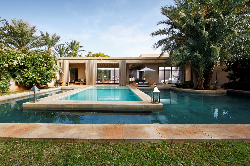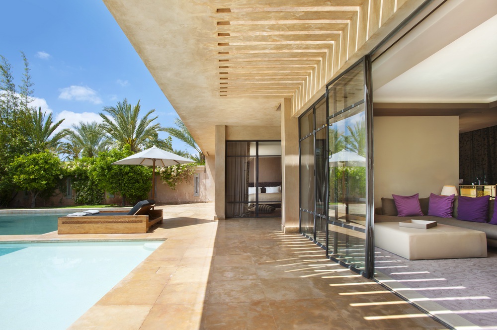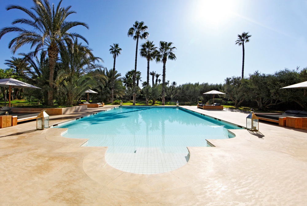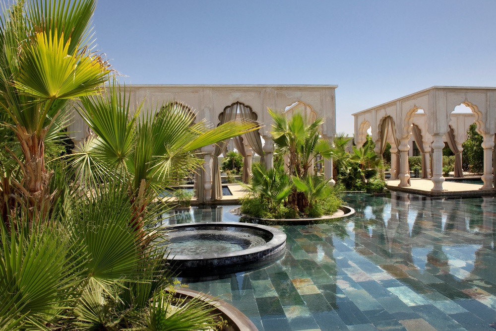 Вілла басейн: 127 м2. Фонтанна вілла в традиційному марокканському стилі оточена садом інгалятором з Бугаїнвіль включає в себе спальню, м'яку вітальню з вогнем, санвузлом, терасою (20 м2) з відкритою ванною, розкішним садом (500 м2) з пальмами, оливками і апелсиновими деревами, злаки, ставок і басейном з підігрівом.