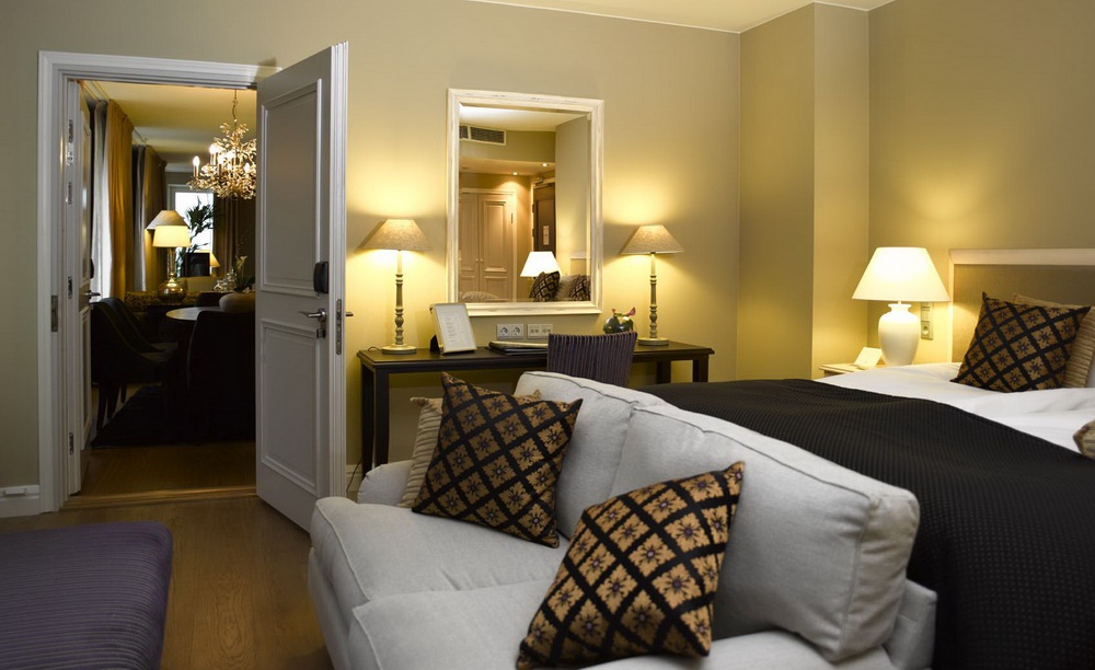 Полулюкс (80-81 кв. м): спальня з вітальнею, санвузол. Додатково: Камінь. Вид президентського палацу, площі Ринок та стипендії. Можливе підключення до кімнати стилю.
