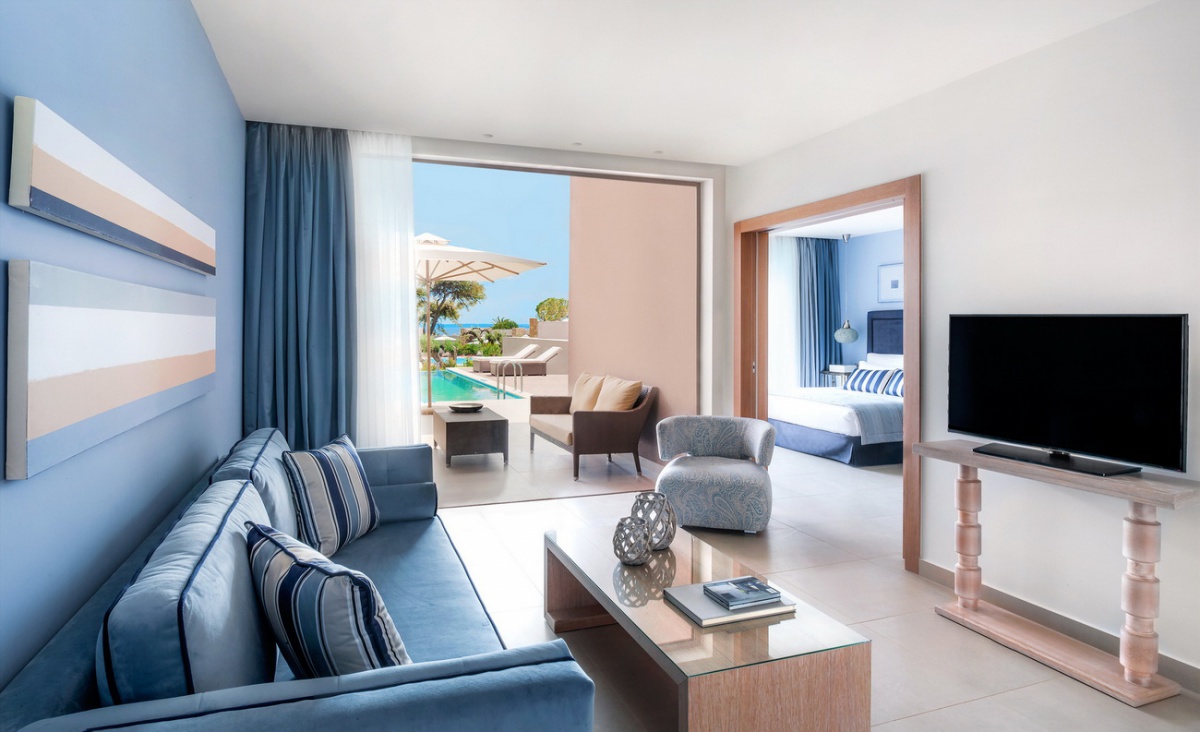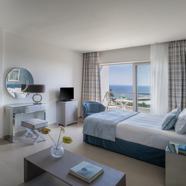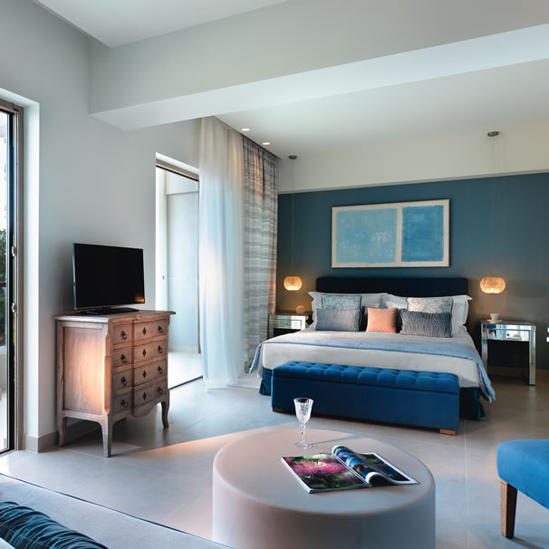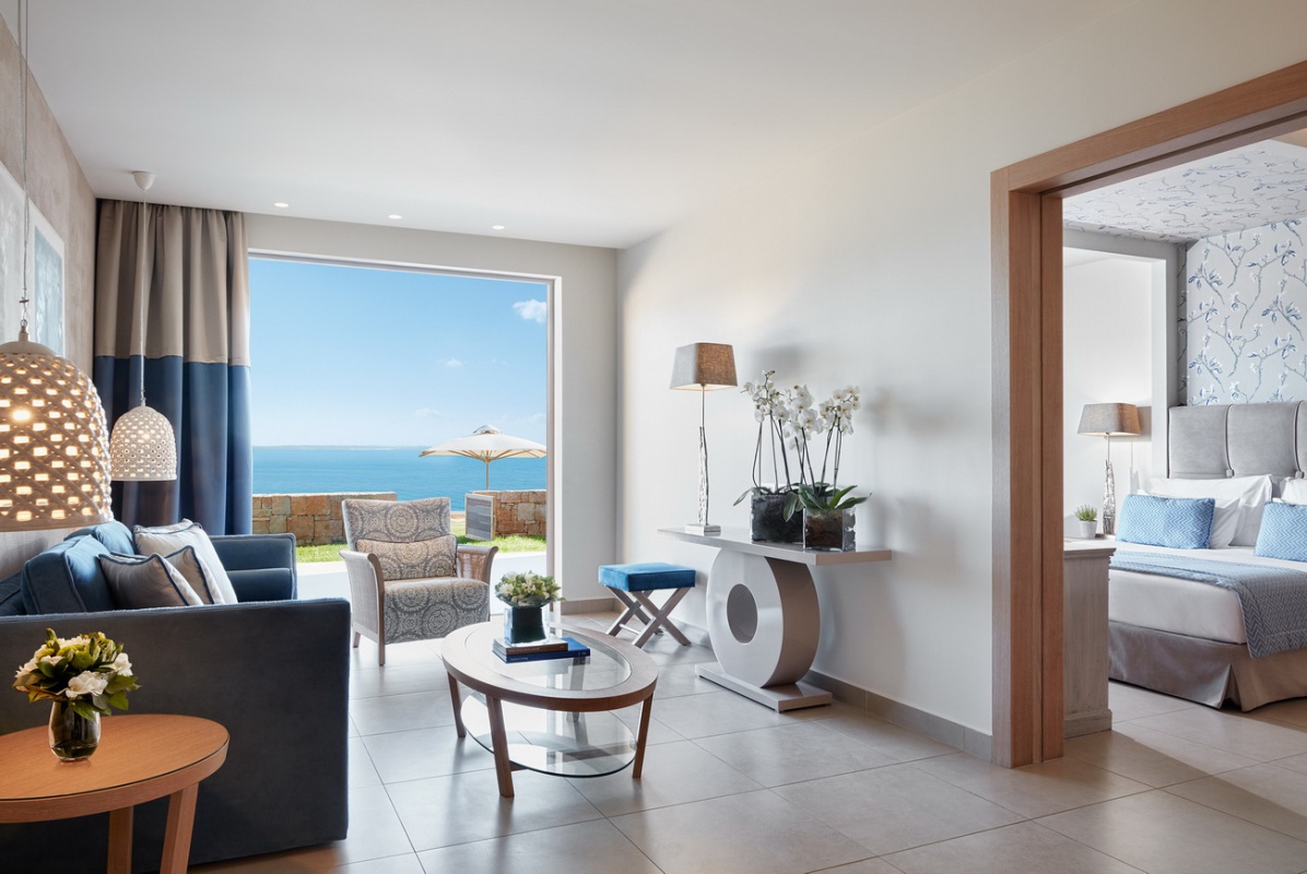 85 кв. Балкон з обідньою зоною на відкритому повітрі (стіл на 4 персони), вітальня з обідньою зоною (стіл на 4 персони), 2 спальні, 2 ванні кімнати (одна – з ванною та душовою кабіною, друга – з душовою кабіною). Номер першої лінії. Гості даних номерів мають спеціальні привілеї в рамках концепції «Делюкс колекція».