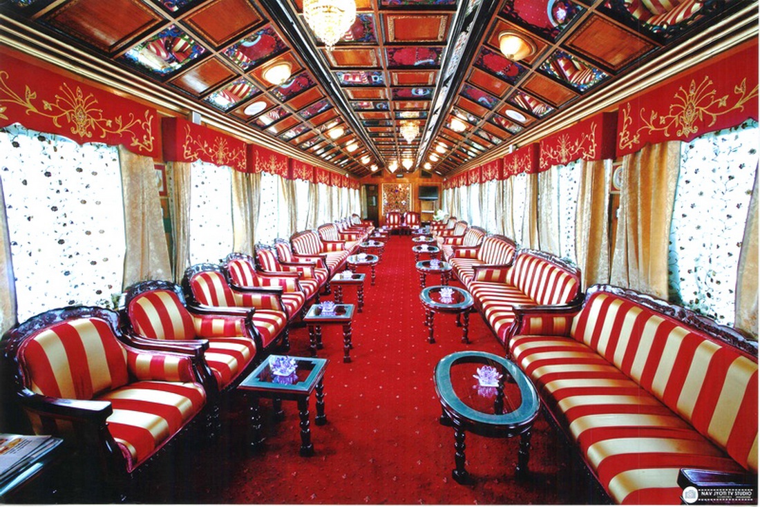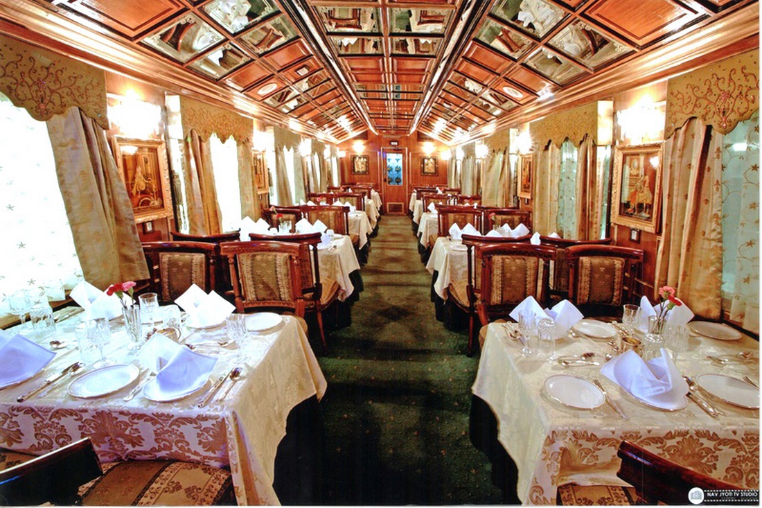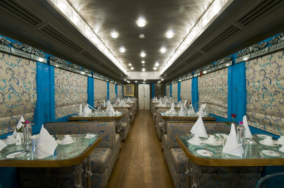 На поїзді є два красивих ресторани, Sheesh Mahal і Swarn Mahal, де індійські, континентальні та китайські кухні подаються вишуканими ніжками.