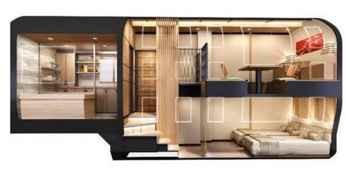 10 вагонів конву включають в себе стандартні люки, оснащені зручними кріслами, які укладають в ліжко. Труби Shiki-Shima будуть виглядати як дворівневі номери з панелями і спальнею з ванною кімнатою на нижній поверсі.