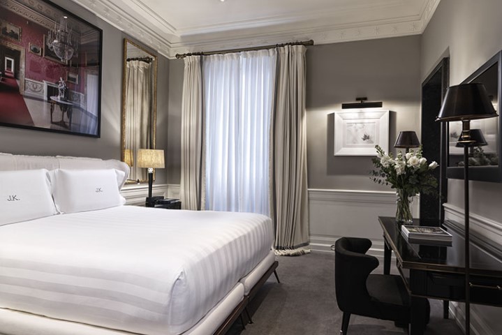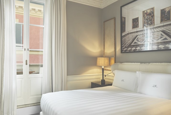 JKDeluxe Room: 40 м2. Складається зі спальні з ліжком king-size, ванної кімнати з оздобленням з італійського мармуру та душем, гардеробної. Номери з дизайнерськими елементами: у деяких ліжках з рожевого дерева з балдахіном, в інших – оздоблення з тканин ручної роботи. За запитом можливі суміжні номери та ліжка twin.