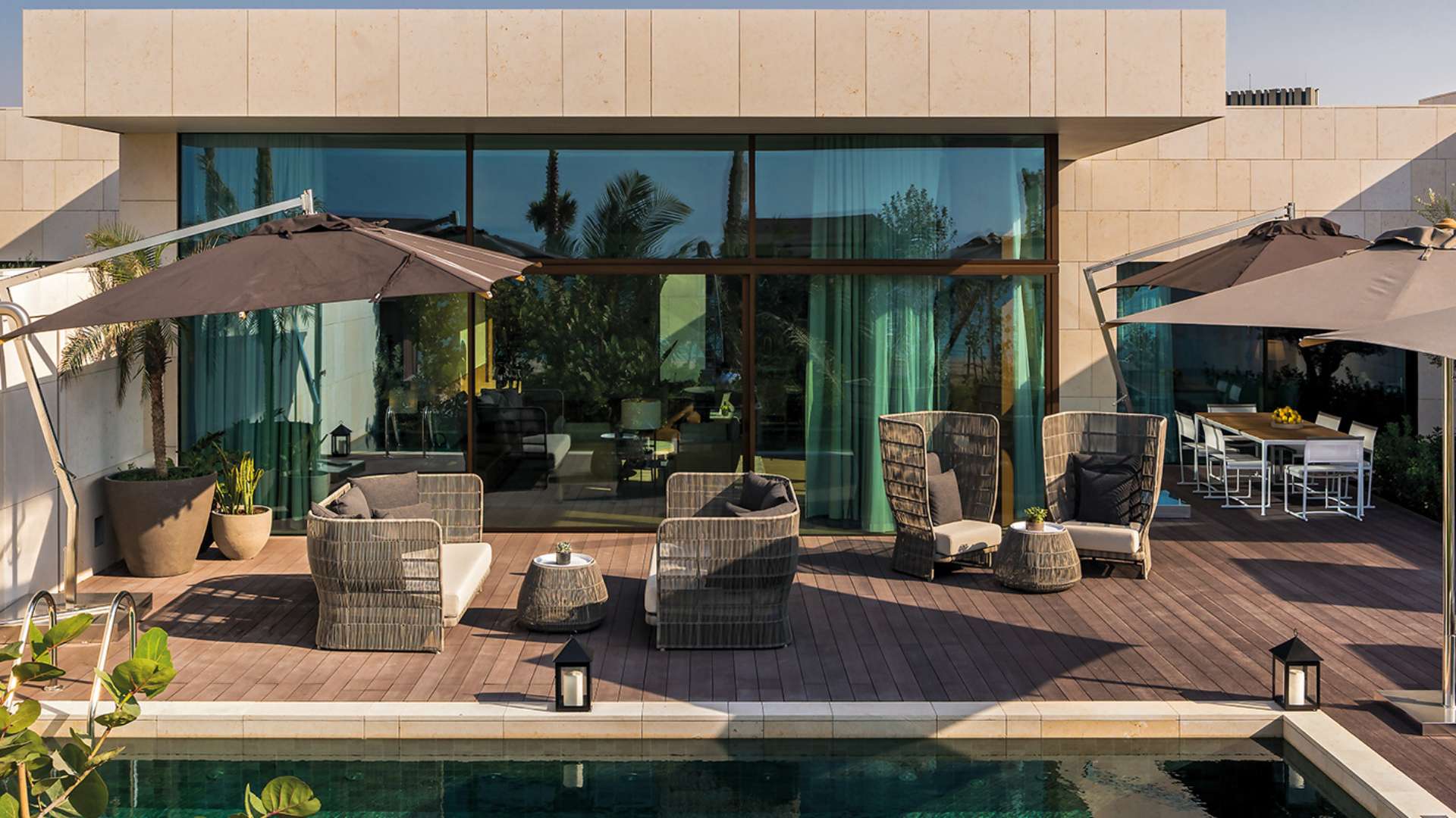 У віллі цієї категорії ви знайдете дві просторі спальні, в одній з яких буде ліжко розміром King size, і два ліжка Queen size в іншій, а також вітальню з панорамним вікном, патіо, де гості можуть розміститися за обідом або вечерею, басейн та терасу. Крім того, у вітальні є робоче місце, а також вілла оснащена повністю обладнаною кухнею, кімнатою для покоївки та вбиральню для гостей.
