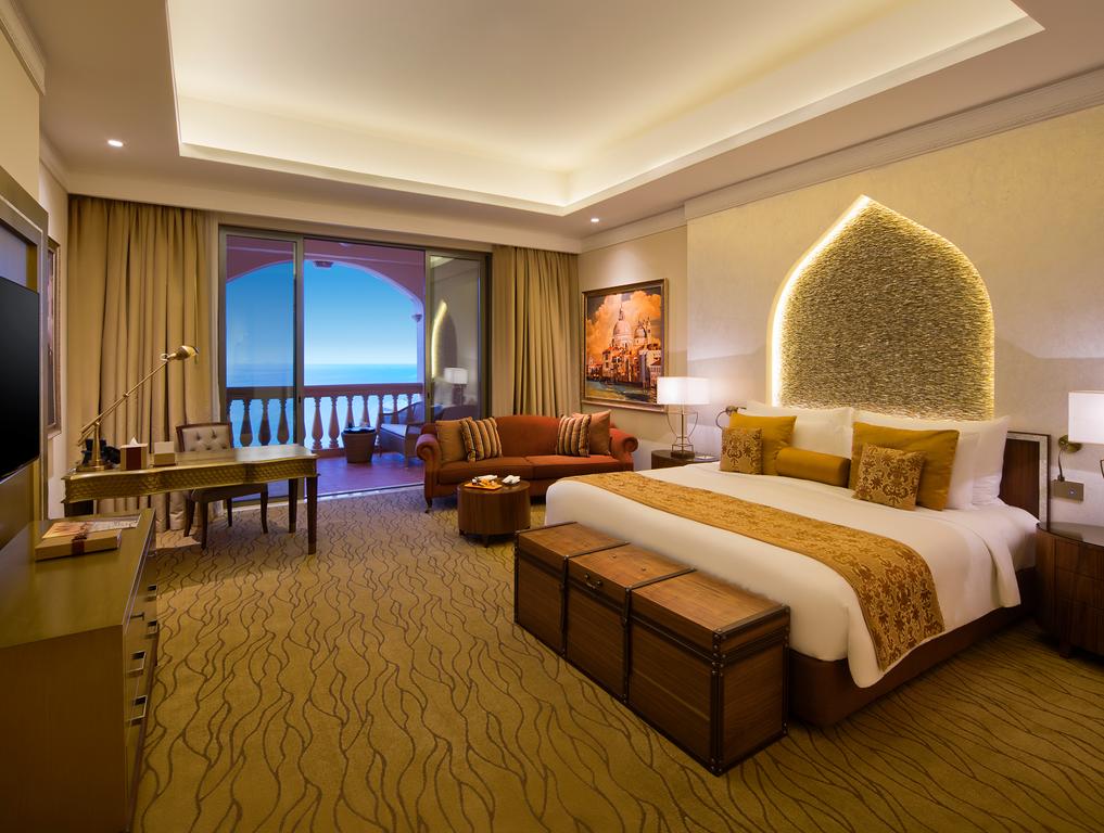 Панорамний Люкс. Пішохідний хетч з ліжком "king-size" і простим відкритим простором (ballcon / тераса) з видом на спокійні лазоуральні води Перської затоки. Панорама номер, ? призначений для сімейного відпочинку. У номері є велика вітальня, окрема їдальня і симпатична ліжко з вікнами від стелі до підлоги.