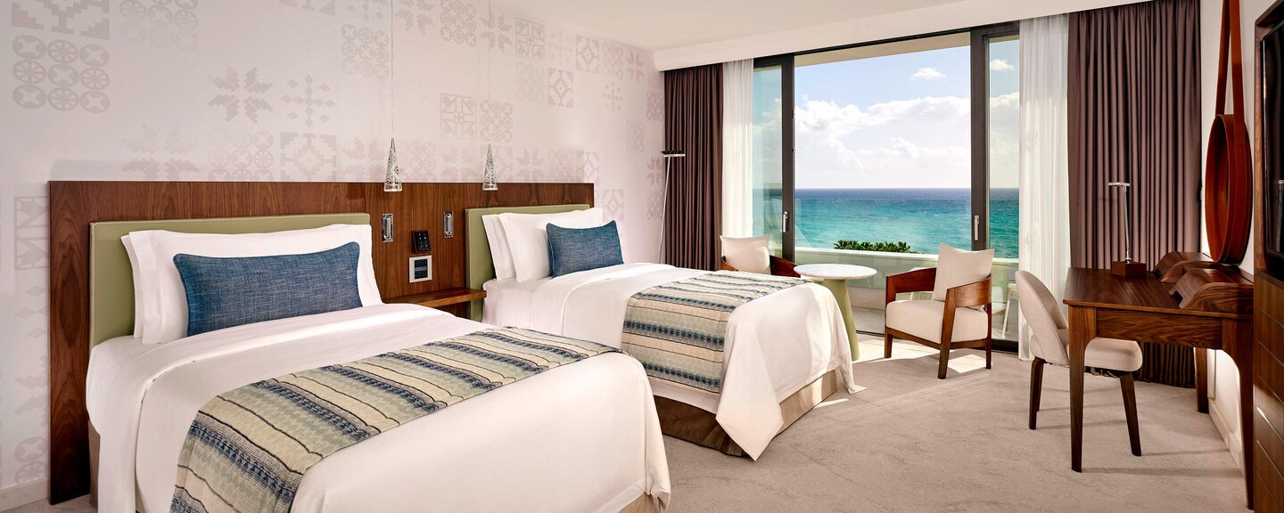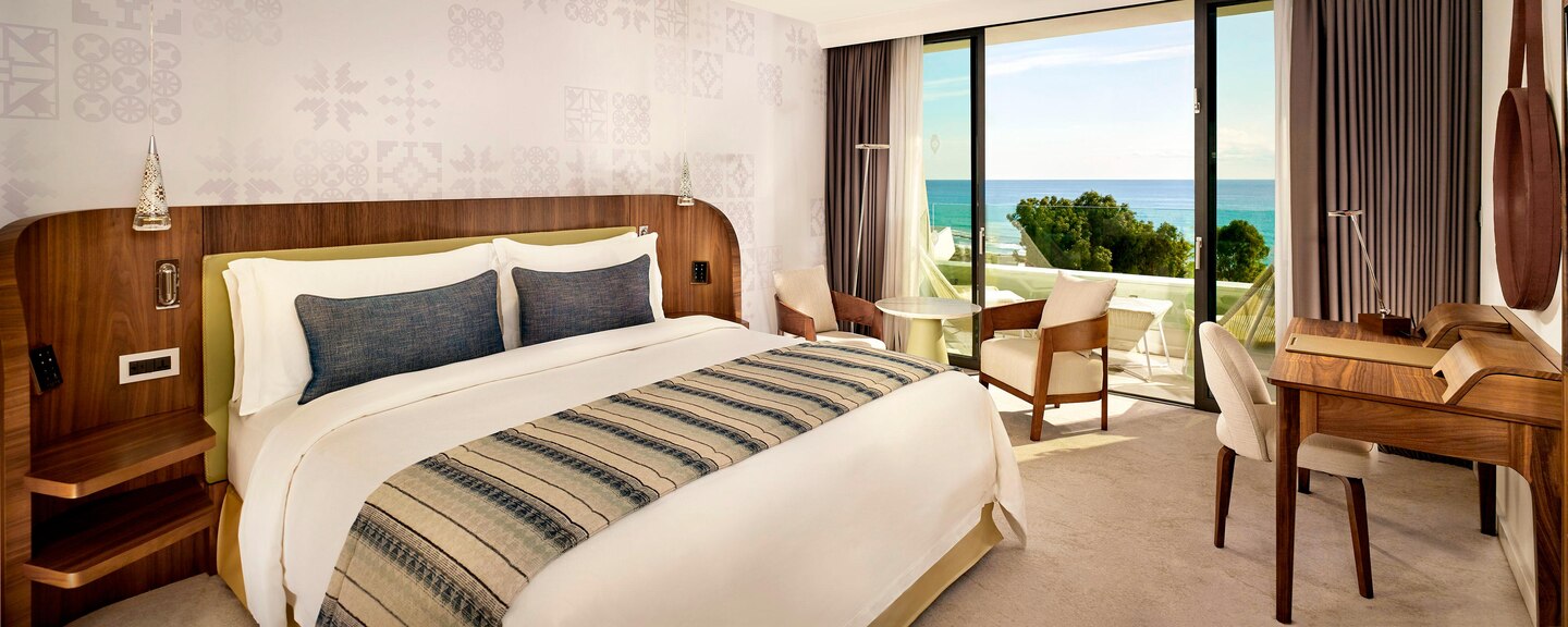 82 м. Бізнес-люкс з видом на море унікально оформлений для розміщення до двох гостей. Два з’єднані між собою балкони та елегантні мінімалістичні інтер’єри відображають кольори та геометричний візерунок острова в люксі. У просторій спальні встановлено фірмове ліжко King-size The Luxury Collection і витончена окрема ванна кімната відкритого планування з тропічним душем. Зона вітальні може похвалитися величним робочим столом, диваном і стільцями. Оснащений ультрасучасними технологіями, починаючи від безключового доступу, Smart TV, акустичної системи JBL і використання Samsung Flip, за запитом.