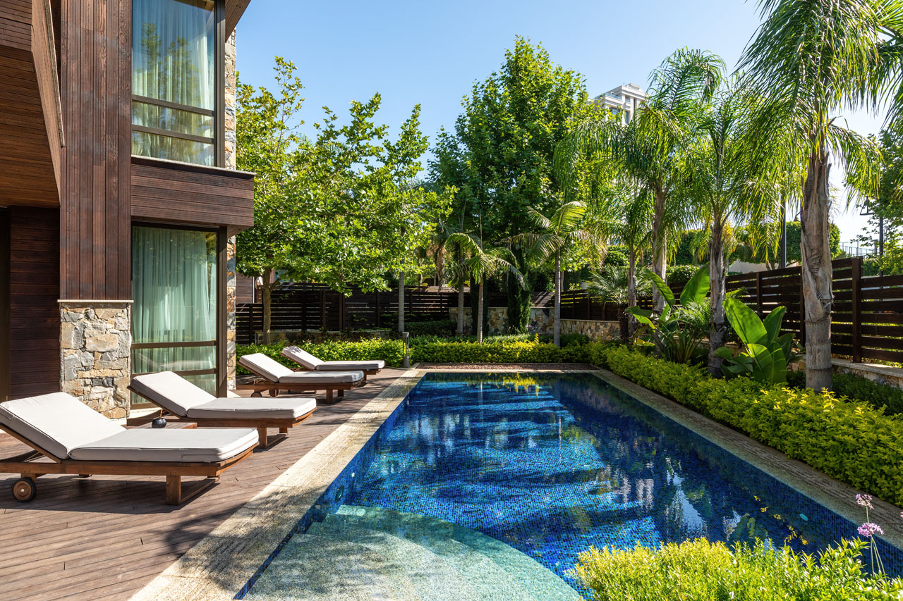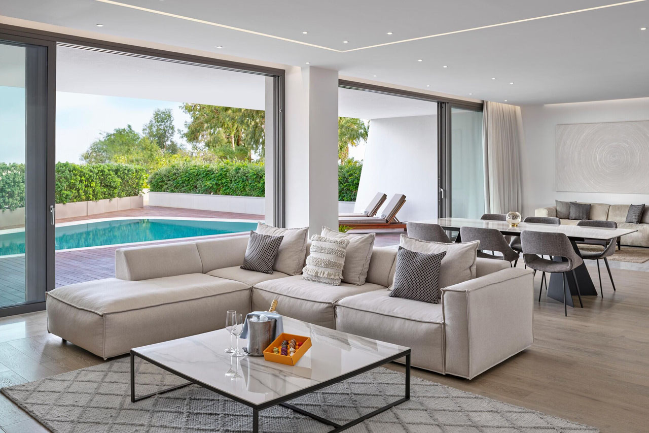 229 м. Вілла Seafront із видом на блискучі води Середземного моря ідеально підходить для чотирьох гостей із двома елегантно мебльованими поверхами. Зони вітальні та їдальні на першому поверсі пропонують новітні технології, зручні дивани та великий обідній стіл. Внутрішні та зовнішні простори взаємодіють зі скляними дверима від підлоги до стелі, відкриваючи привабливий вид на море, яким можна насолоджуватися з лежаків під відкритим небом навколо приватного басейну. Сходи ведуть до двох кімнат, кожна з яких виходить на терасу з видом на море. Спальні оточують велику гардеробну та туалетний столик. Окрема ванна кімната з тропічним душем, подвійною раковиною та ефектною овальною ванною приваблює до омолодження.