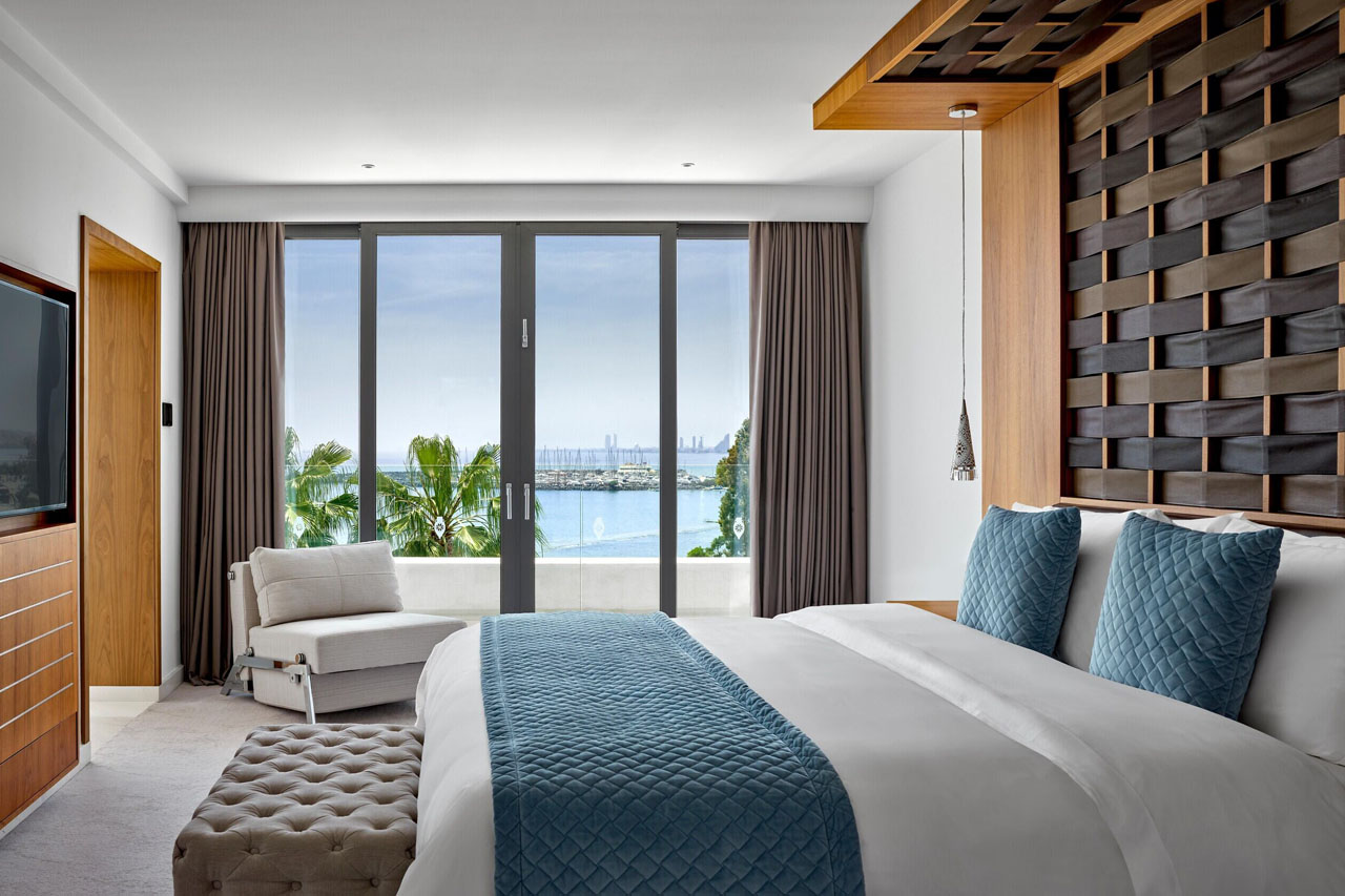 38 м. Покращені номери з видом на море ідеально підходять для двох гостей з місцем для дитячого ліжечка. Вони оснащені вікнами від підлоги до стелі, які ведуть на відкриту терасу з кріслами. Комфортабельні номери з двоспальним ліжком розміру "king-size" або двома односпальними ліжками оформлені в кіпрському стилі з елементами меблів з лефкарського мережива. Світле дерево та вишукані кольори доповнюють загальну стильність кімнат, а сучасні технології включають 55-дюймовий телевізор Samsung або динаміки JBL. У кожному номері є окрема ванна кімната з ванною або окремою душовою кабіною з тропічним душем, а також розкішні туалетно-косметичні засоби та зручні халати. Можливі варіанти суміжних номерів.