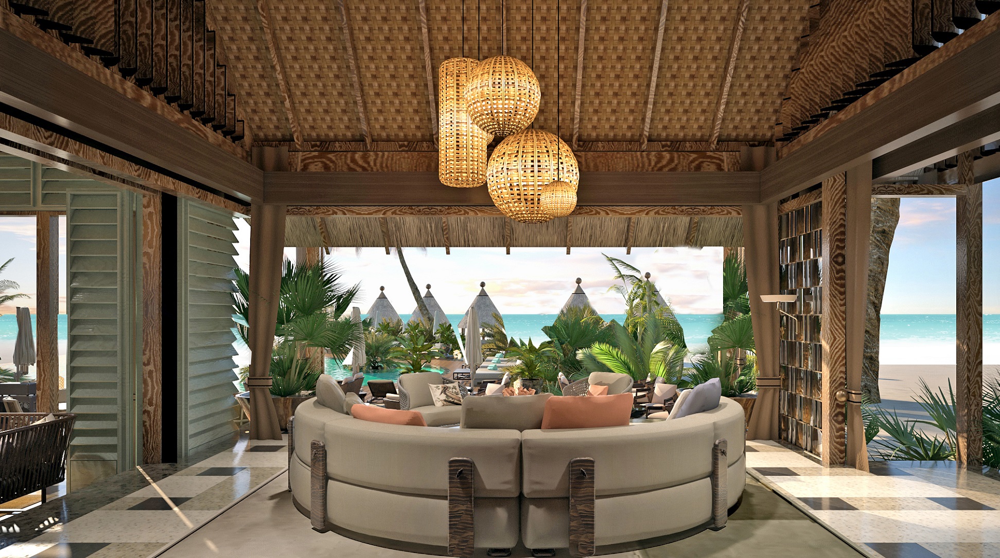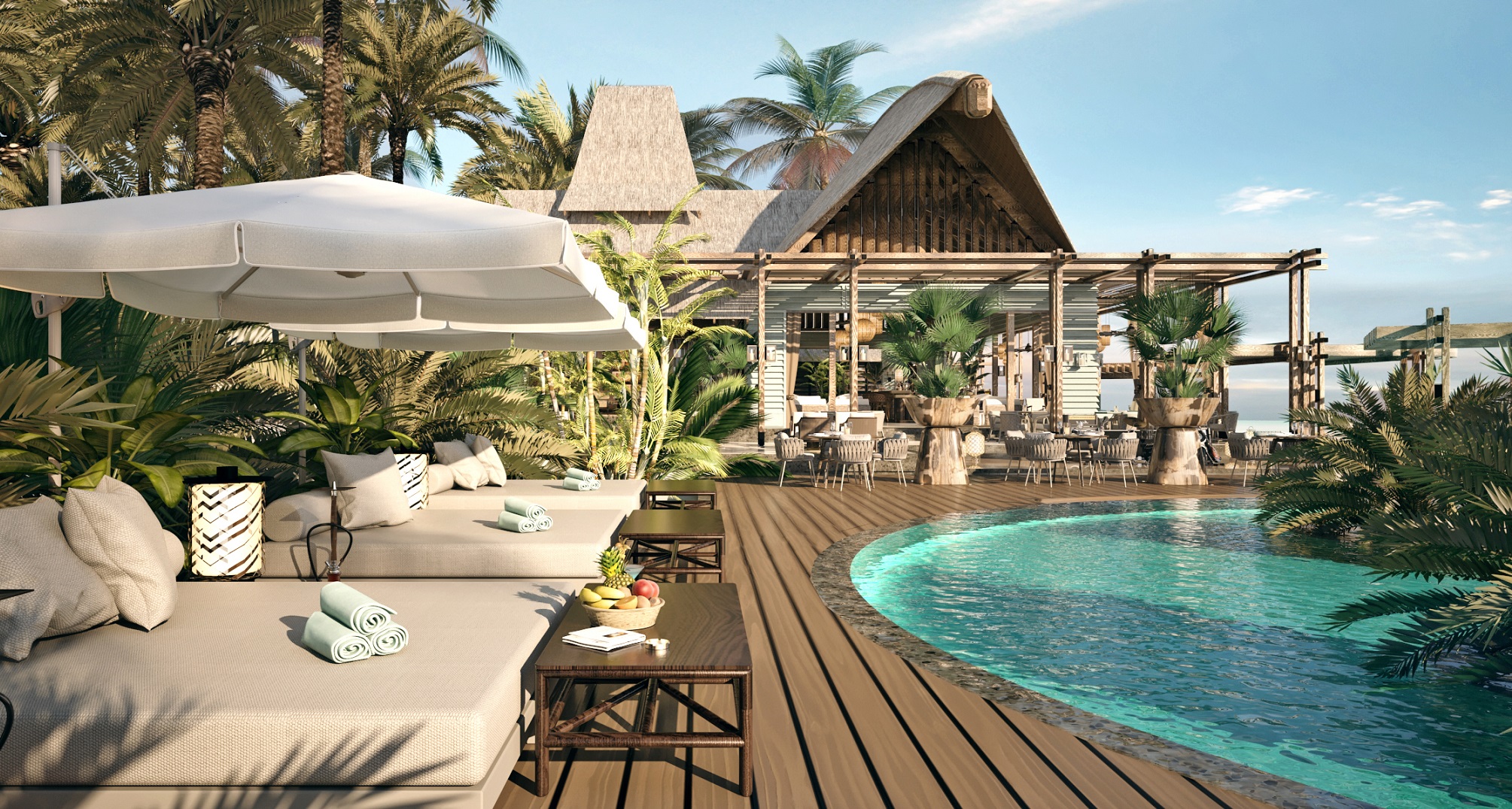 Площа внутрішніх приміщень складає 108 кв.м, загальна – 680 кв.м. Розкішна вілла з великим басейном складається зі спальні з великим ліжком, зоною відпочинку, туалетним столиком та робочою зоною, ванної кімнати зі спа-зручностями та ексклюзивним туалетним приладдям, окремого туалету. Поруч із басейном знаходиться мебльована тераса, пляж обладнаний шезлонгами. Пляжна вілла має панорамний вид на океан і приватний сад. Гостям доступні послуги камердинера та дворецького. Розміщення: 3 особи.