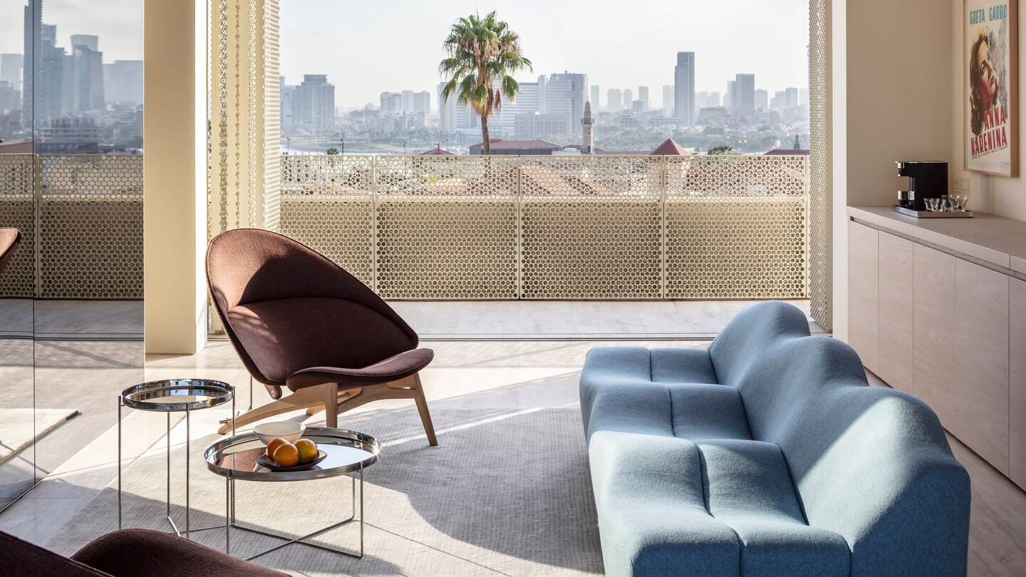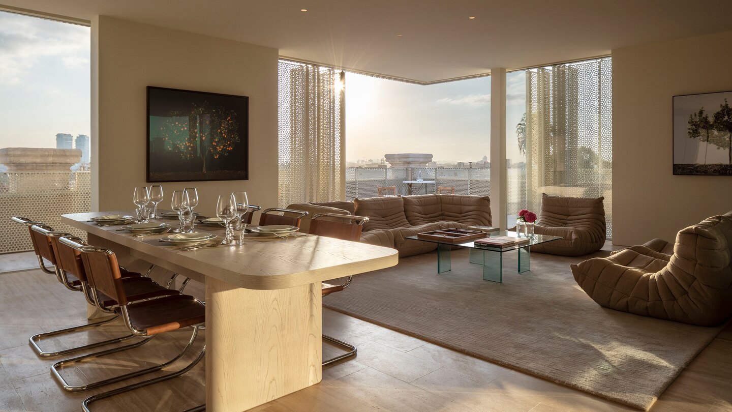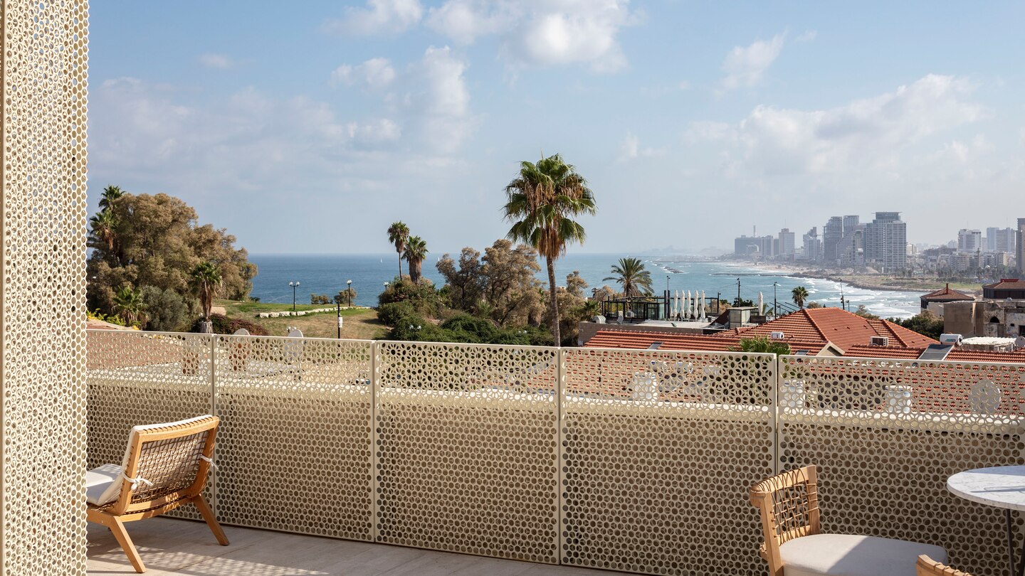 73-95 кв. м. Люкс розташований на новому поверсі історичного крила будівлі готелю і складається з спальні з Super King ліжком, робочою зоною і дзеркалом на підлозі, окремої вітальні, лазні з травою з імбирним душем, великим балконом з шиферами, з яких відкривається панорамний вид на Тель-Авів - Яффо і Середземномор\'я. Додаткове ліжко і дитяче ліжко доступні. Місце: 2 дорослих і 1 дитина.