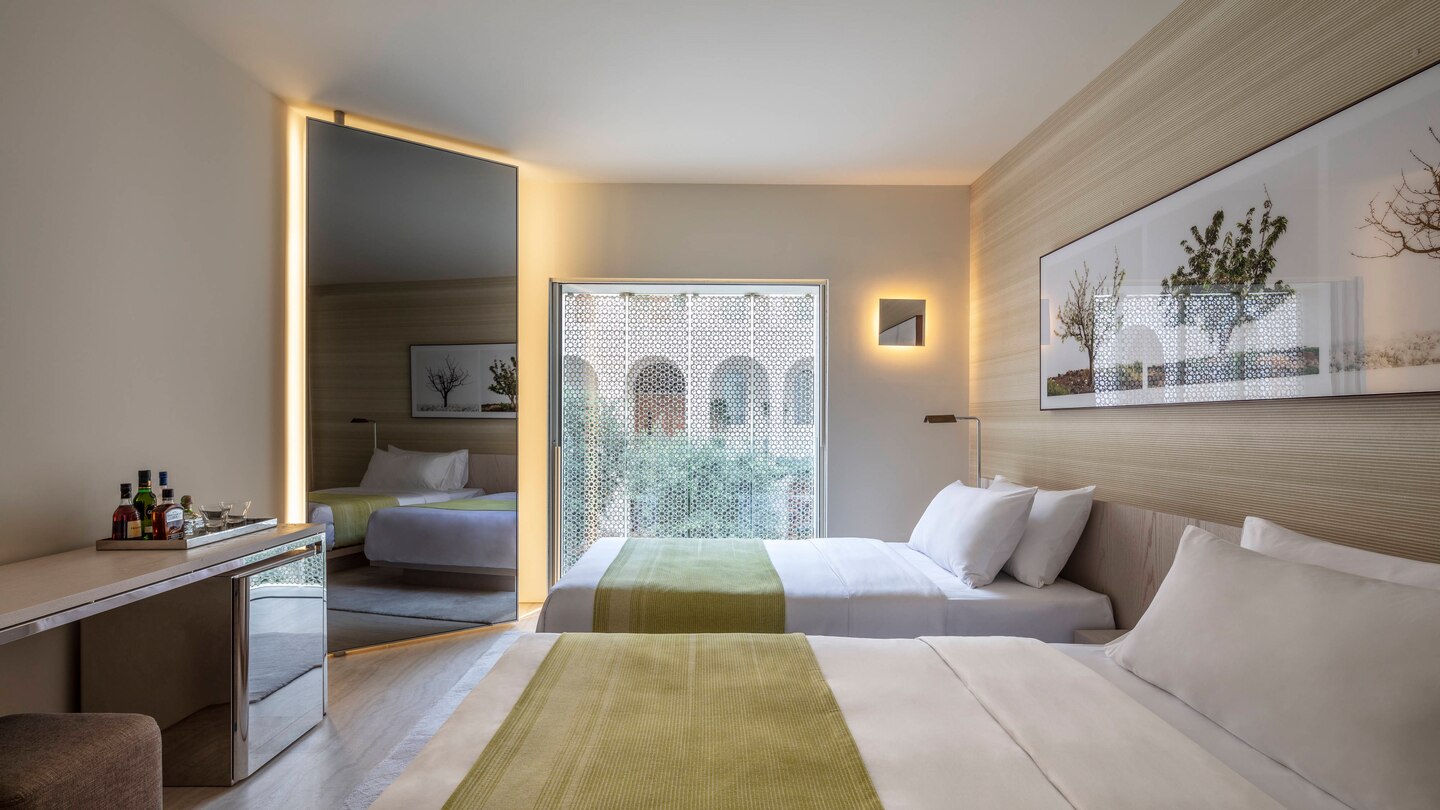 31 кв. м Номер в сучасному крилі будівлі готелю складається з " King " ліжко або два Super twin ліжка, зона відпочинку, робочий стіл і величезне дзеркало в підлозі, симпатична ванна з травним мармуром, обладнаний дощовим душем, балконом з видом на місто Yaffo, внутрішній дворик або басейн. Місце: 2 дорослих і 1 дитина.