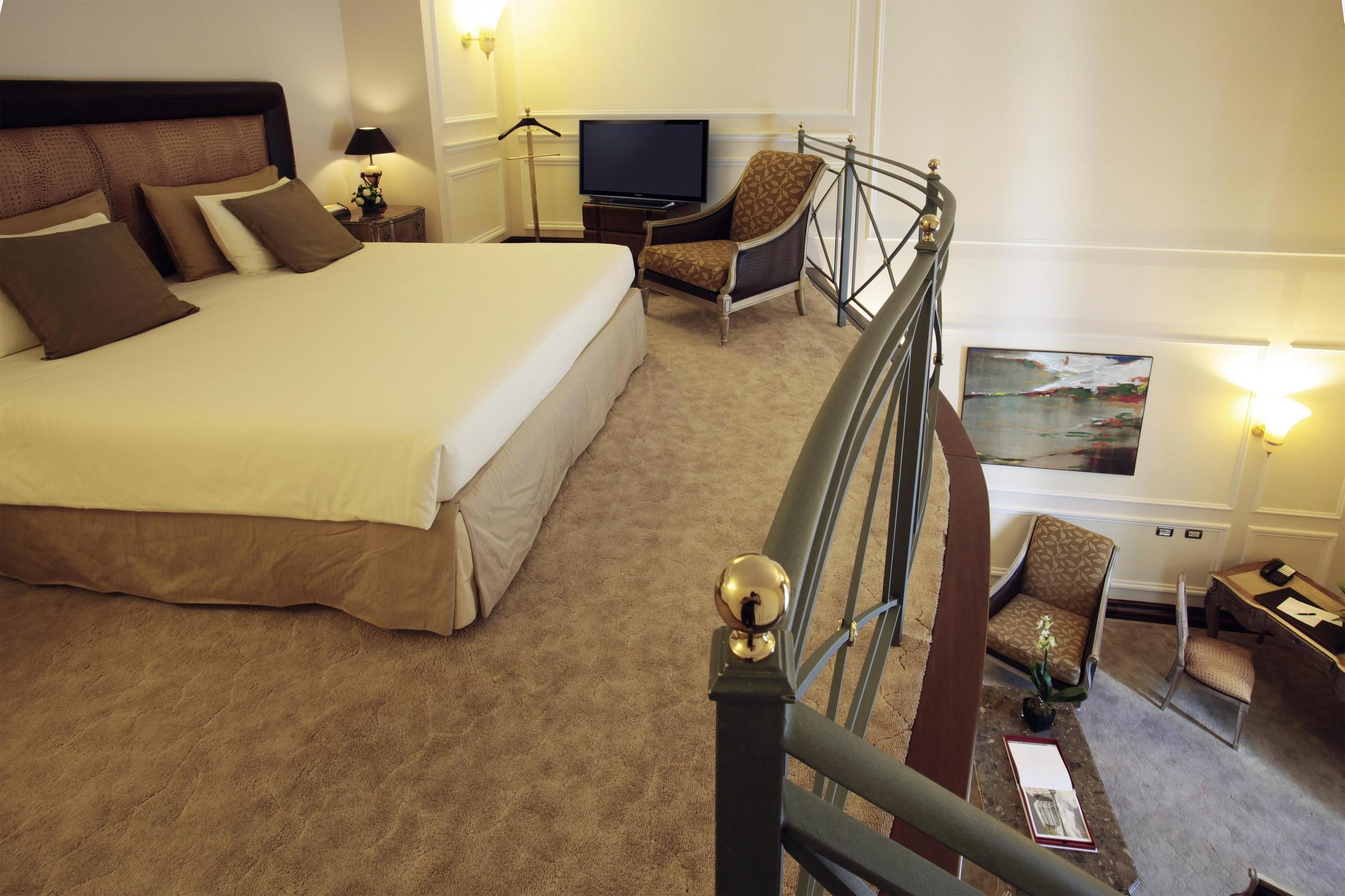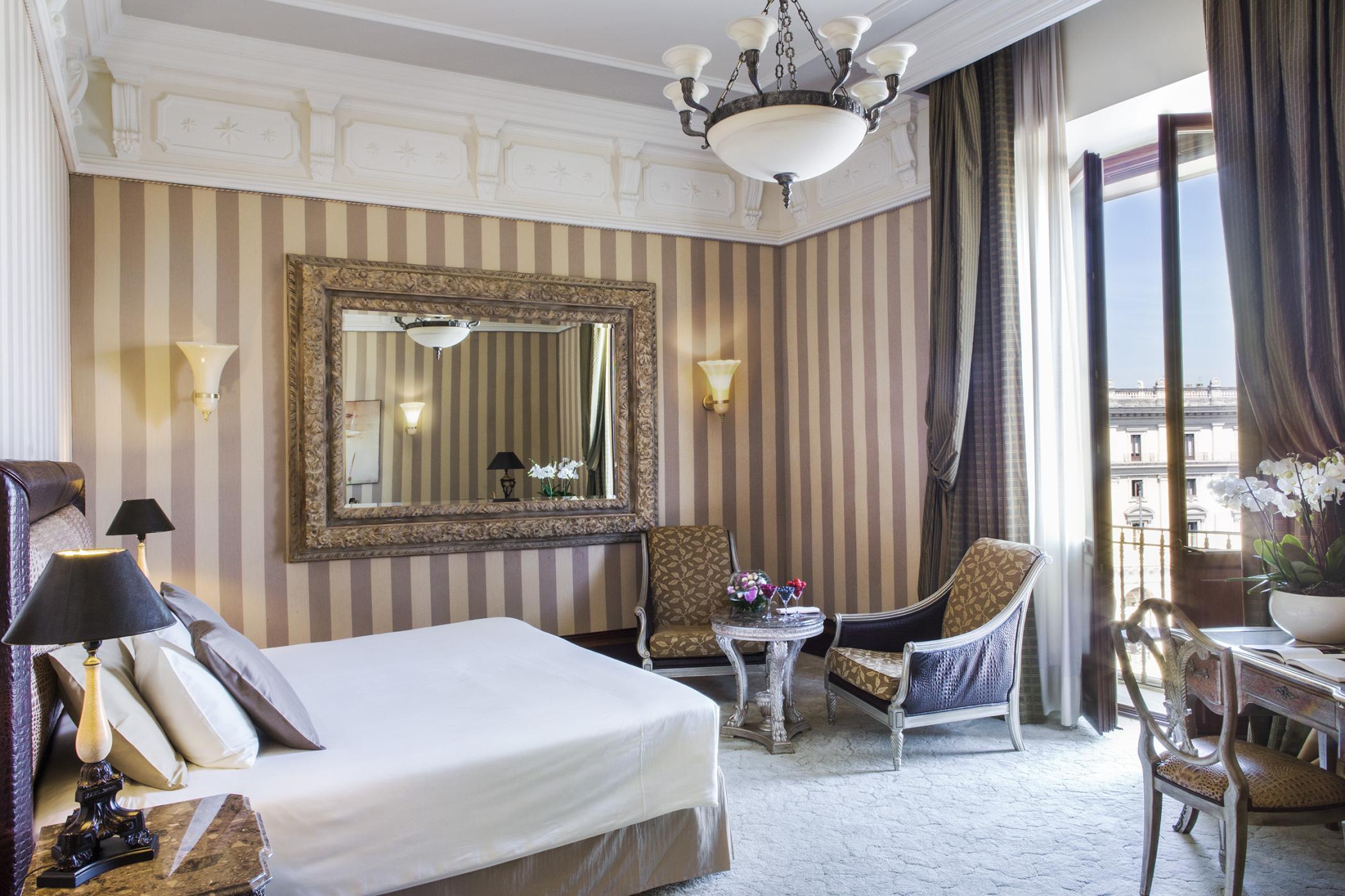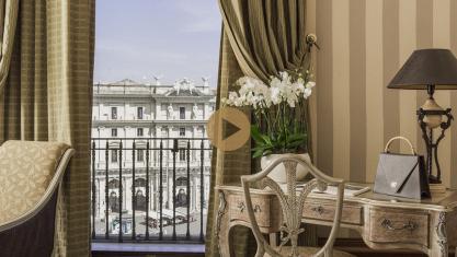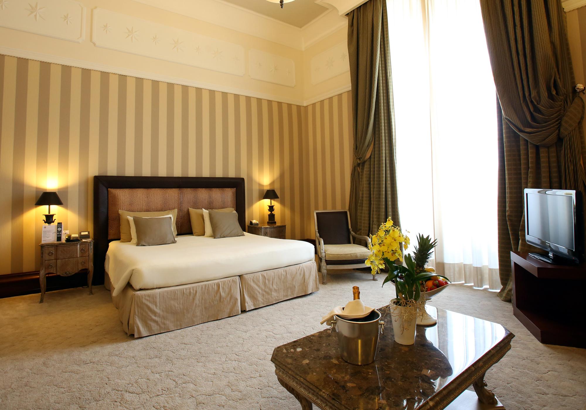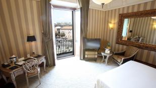 Просторий номер зі спальнею з широким королівським ліжком, приватним балконом та панорамним видом на площу. Також є мармурова ванна кімната з ванною і душем.