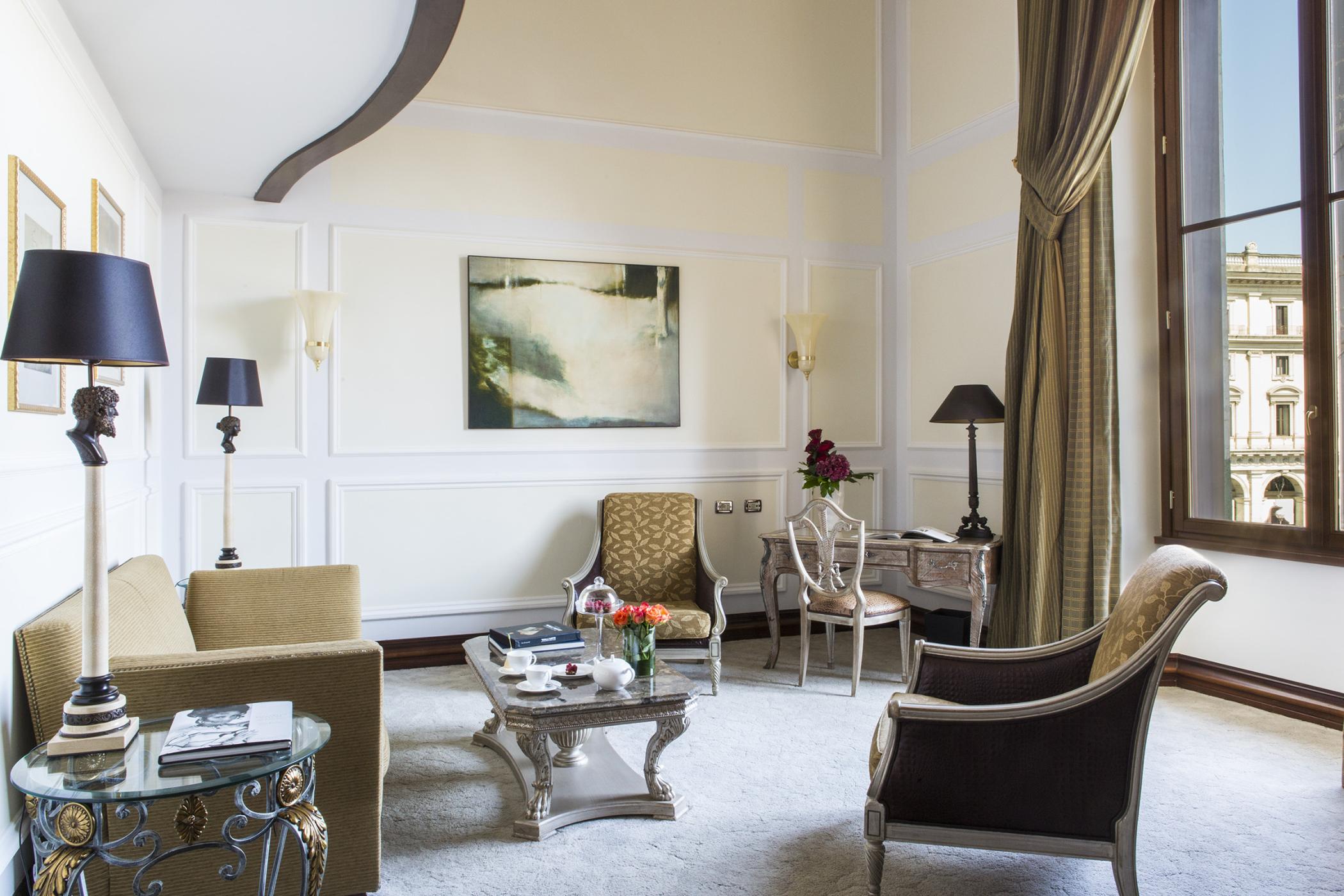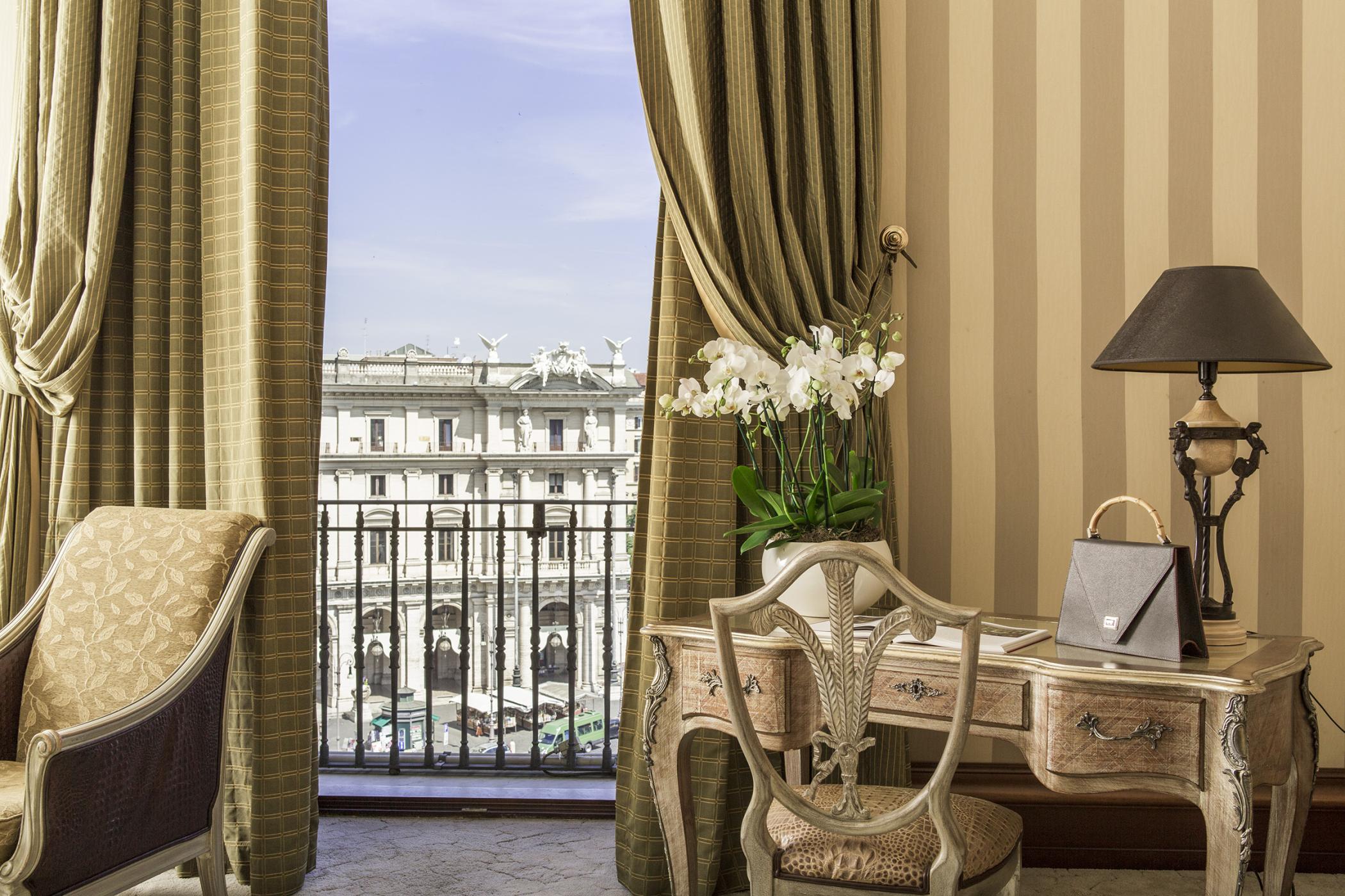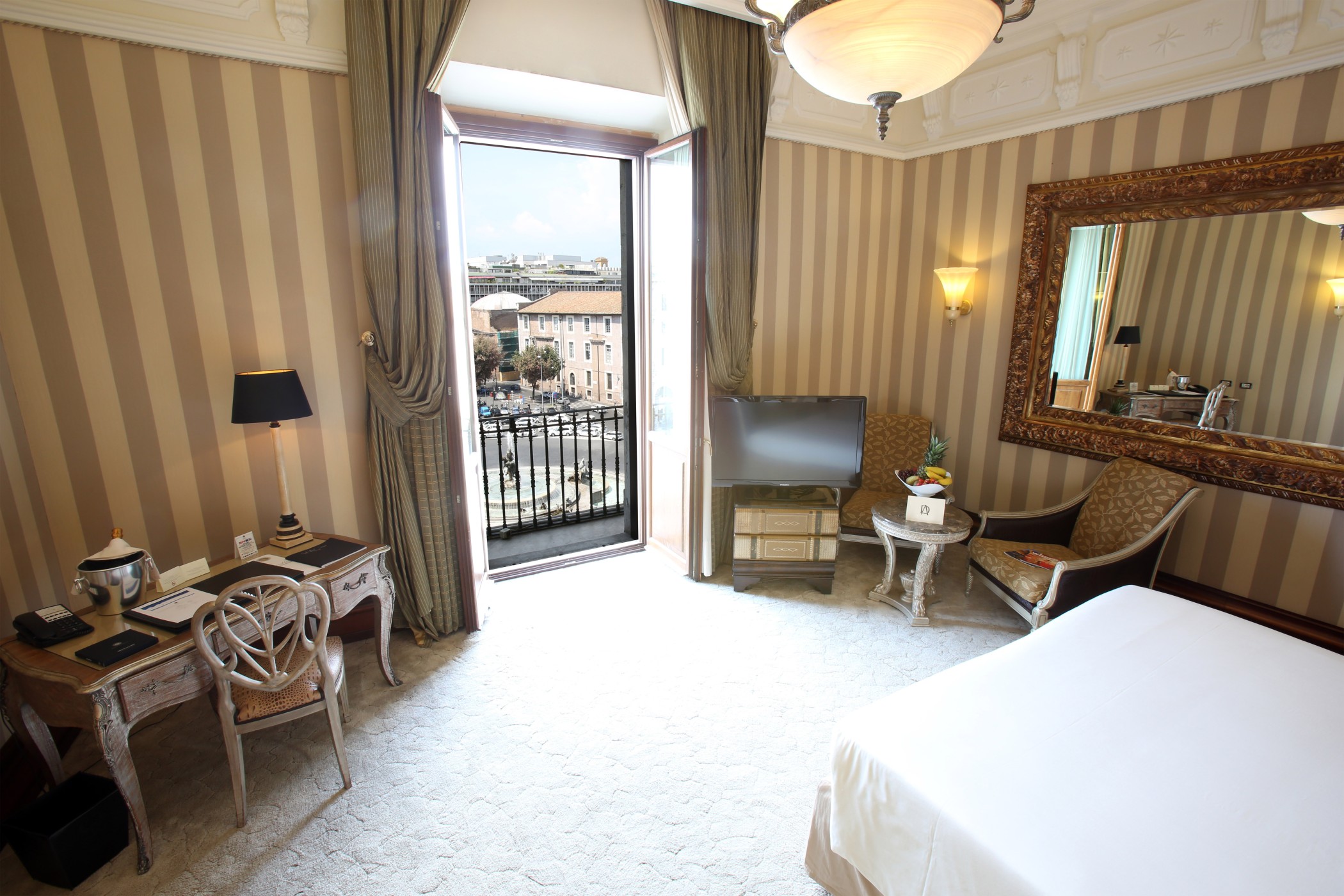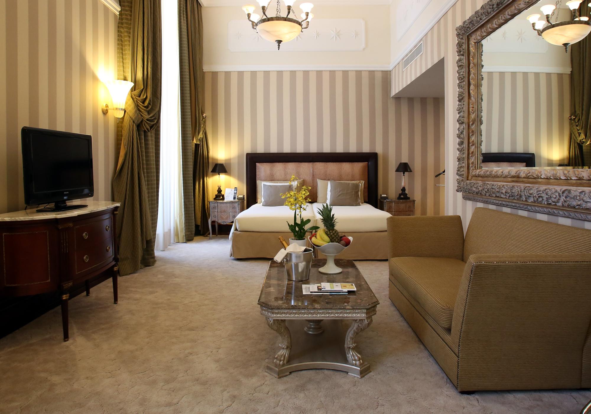 Просторий номер зі спальнею з широким королівським ліжком, приватним балконом та панорамним видом на площу. Також є мармурова ванна кімната з ванною і душем.