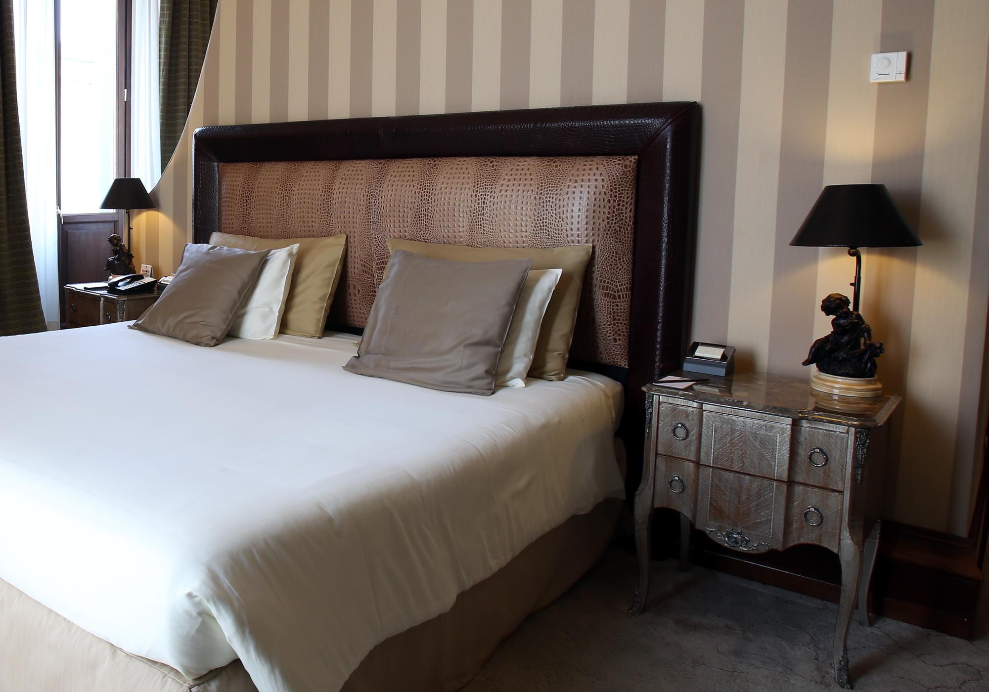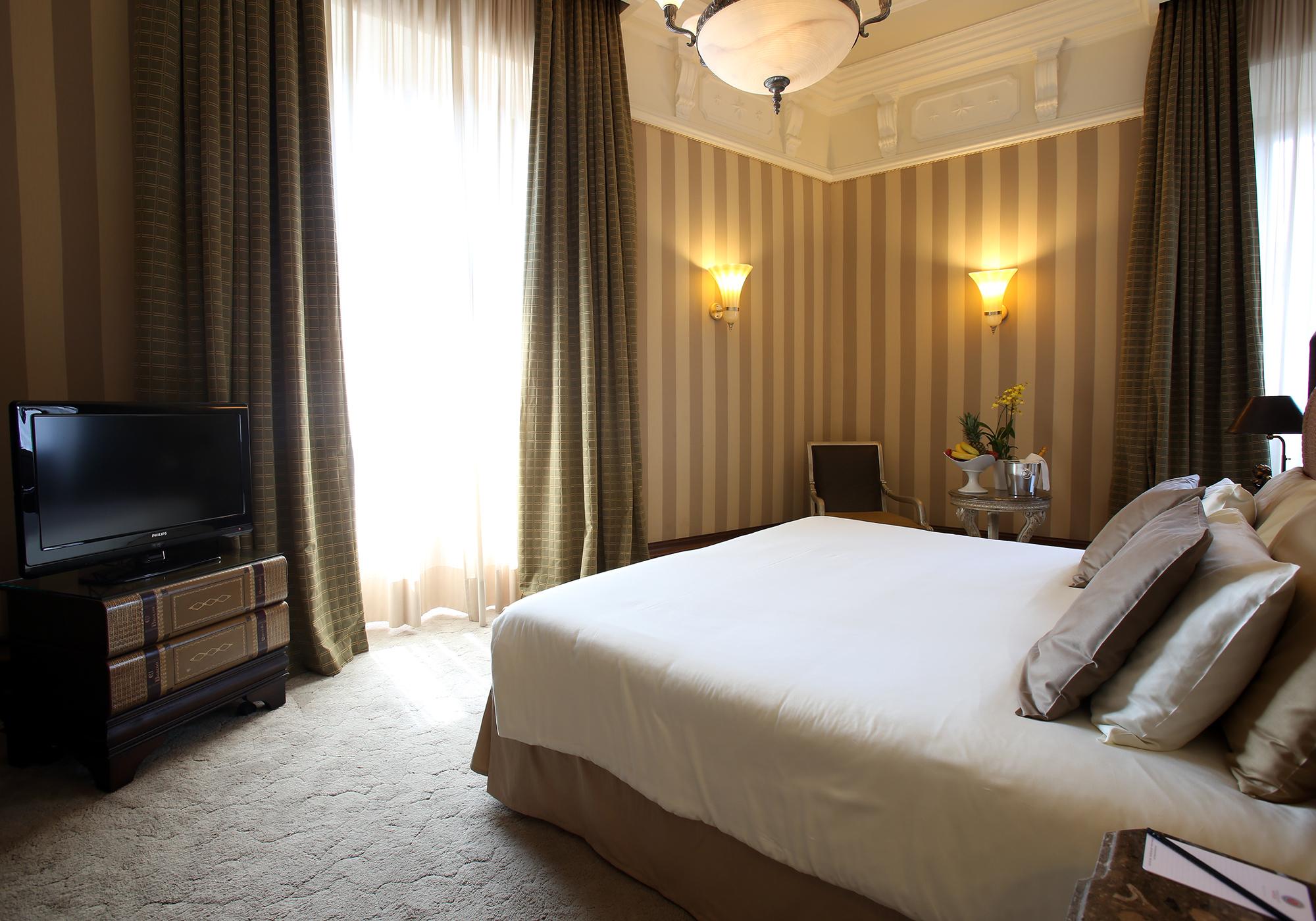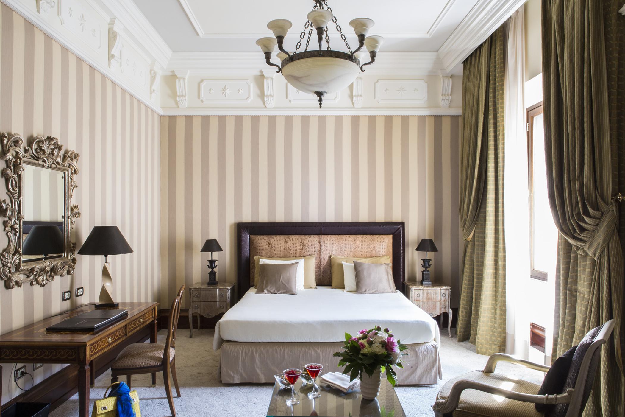 Затишний номер, виконаний в елегантному неокласичному стилі з мармуровою ванною кімнатою і широким двоспальним ліжком.
