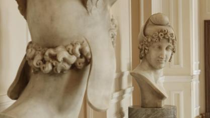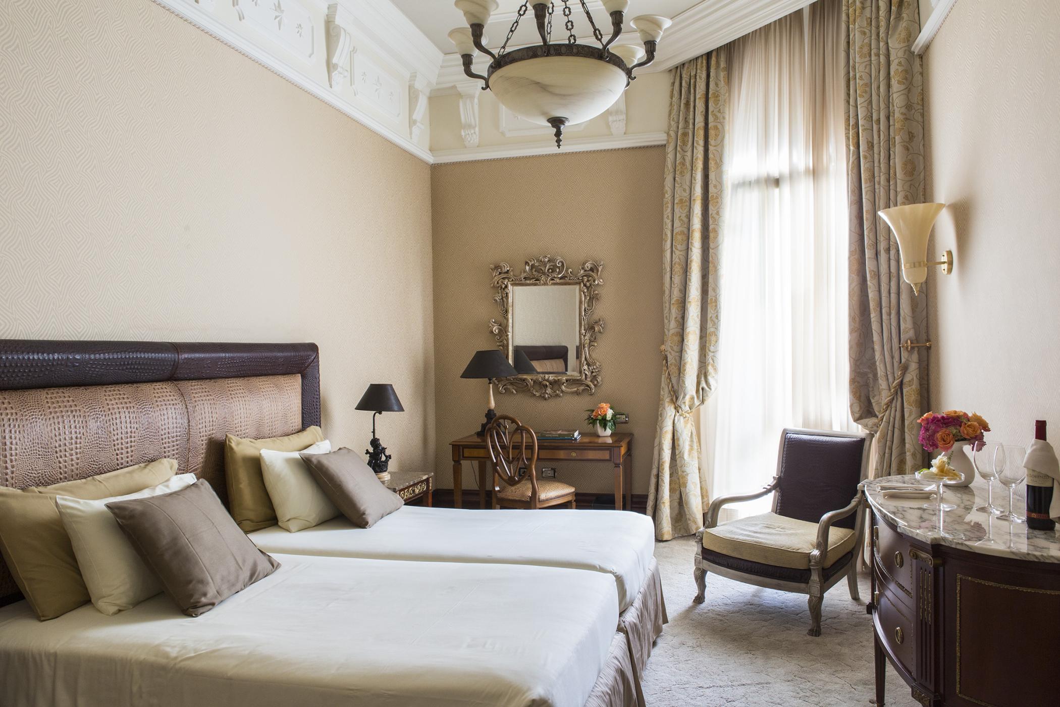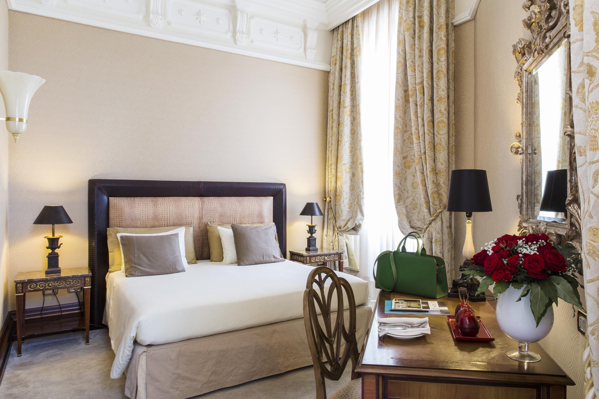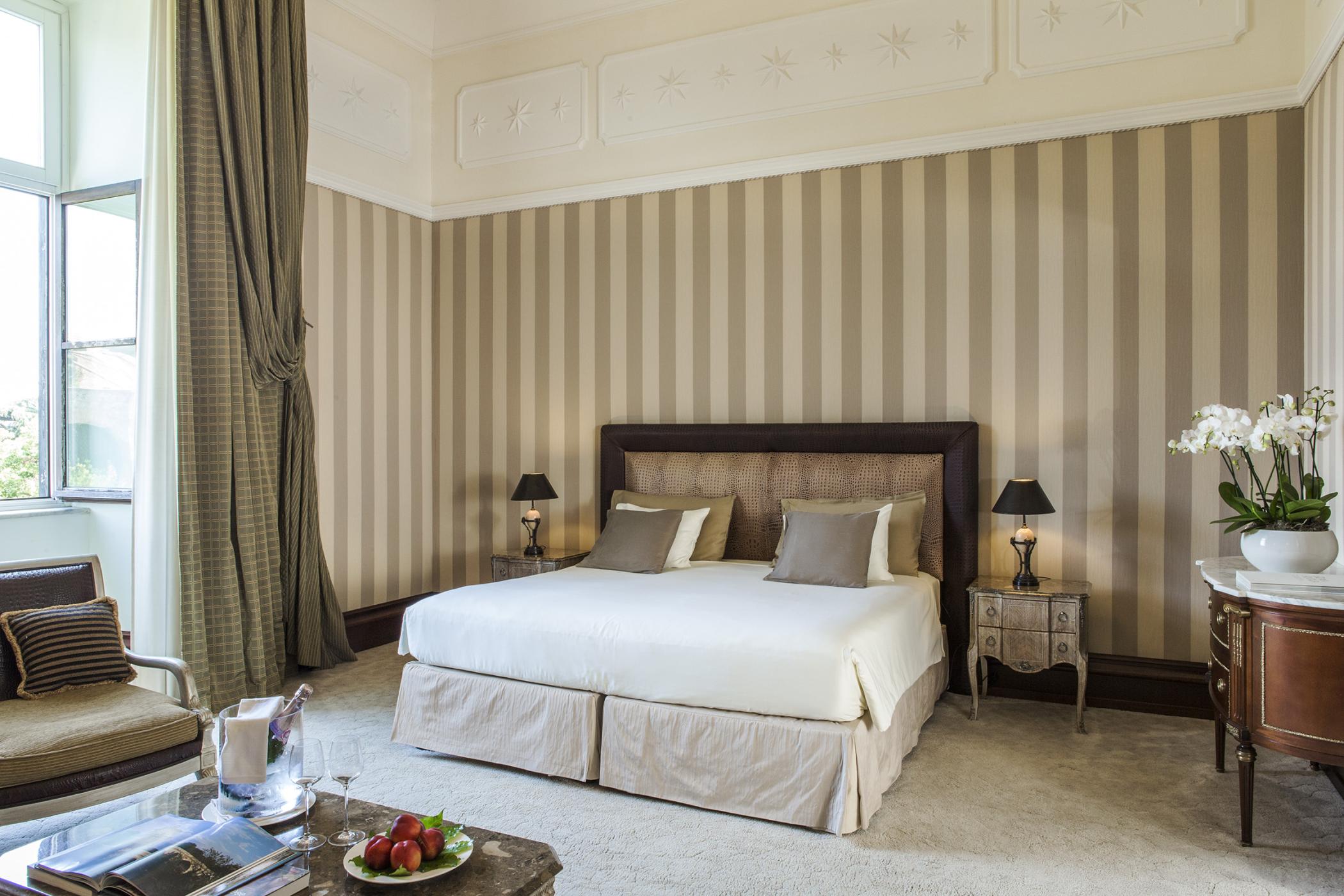 Затишний номер, виконаний в елегантному неокласичному стилі з мармуровою ванною кімнатою і широким двоспальним ліжком.
