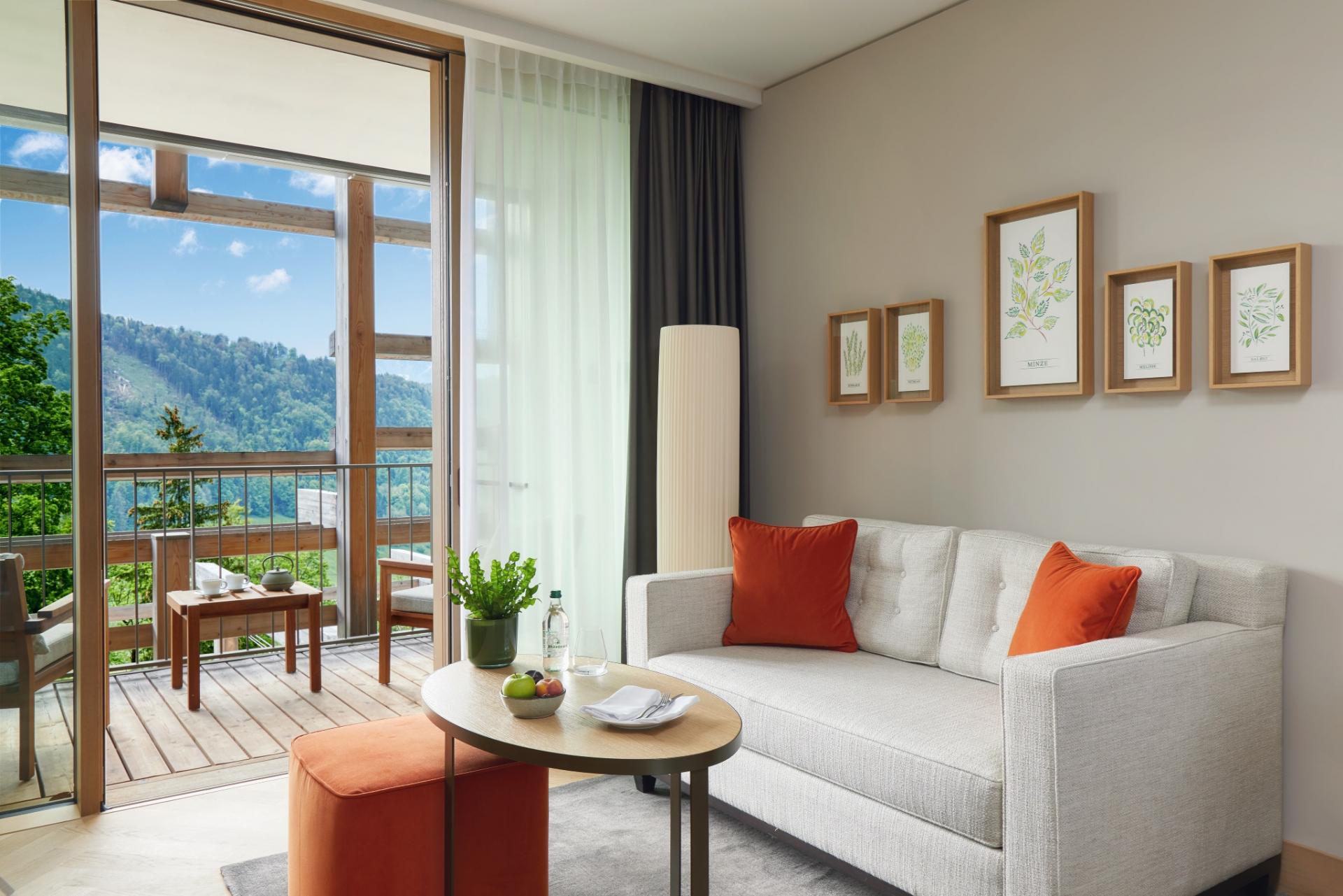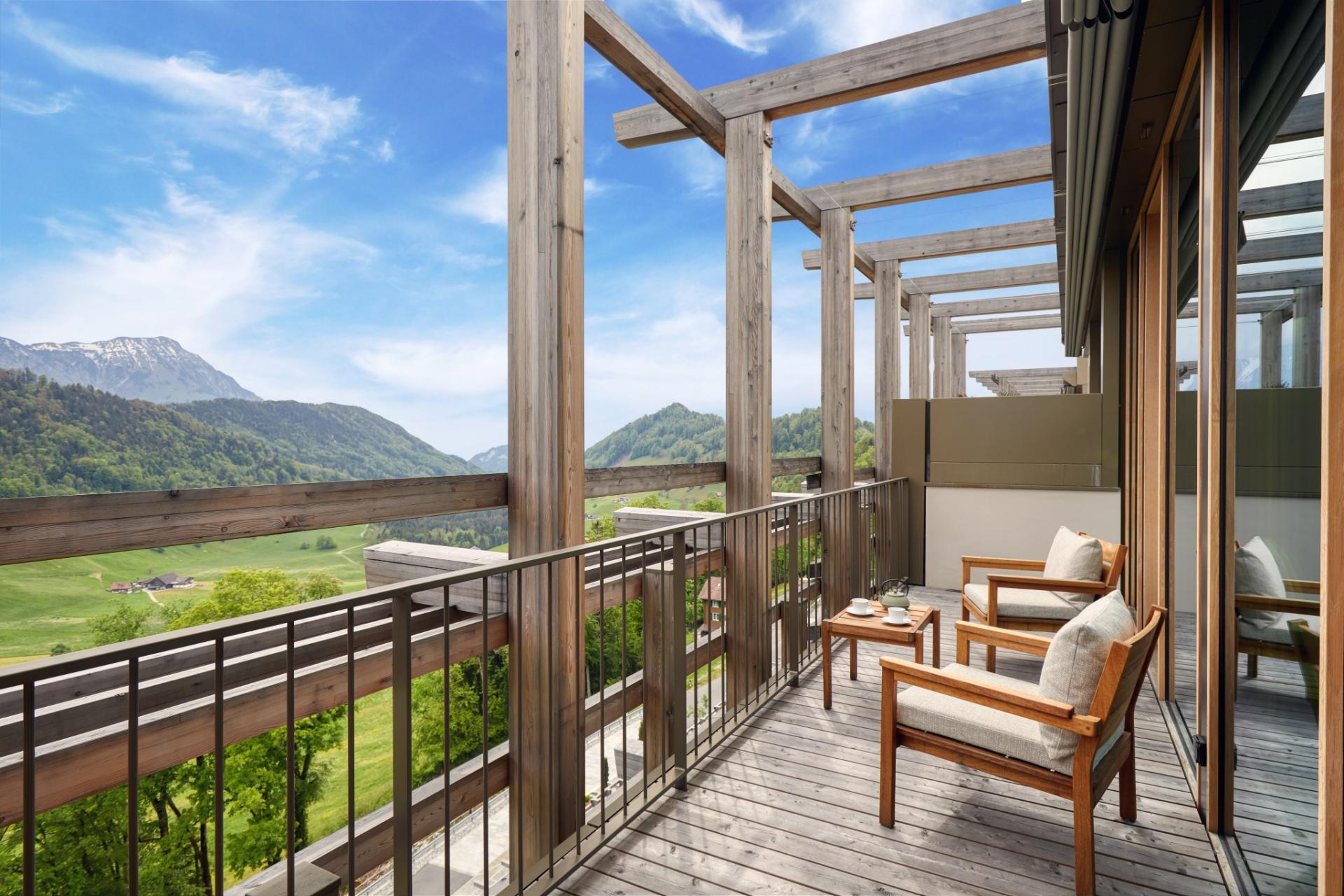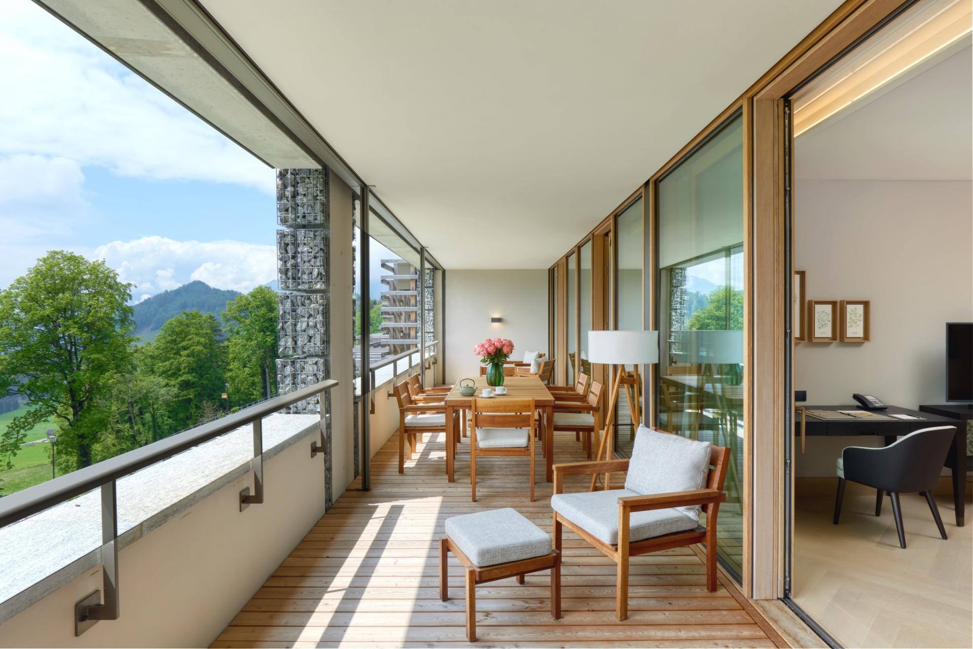 40 кв. м Номер з підлогою до стелі складається з спальні, яка об\'єднана ліжком king size або двома ліжками розміру близнюка, дивана і робочого столу, ванної кімнати зі скляною перегородкою, санвузлом і окремим тропічним душем. Кількість закруглених сонячних балконів (7 кв. м). Вид альпійський. Доступний номер і дитяче ліжко. Розміщення: 2 дорослих і 1 дитина.