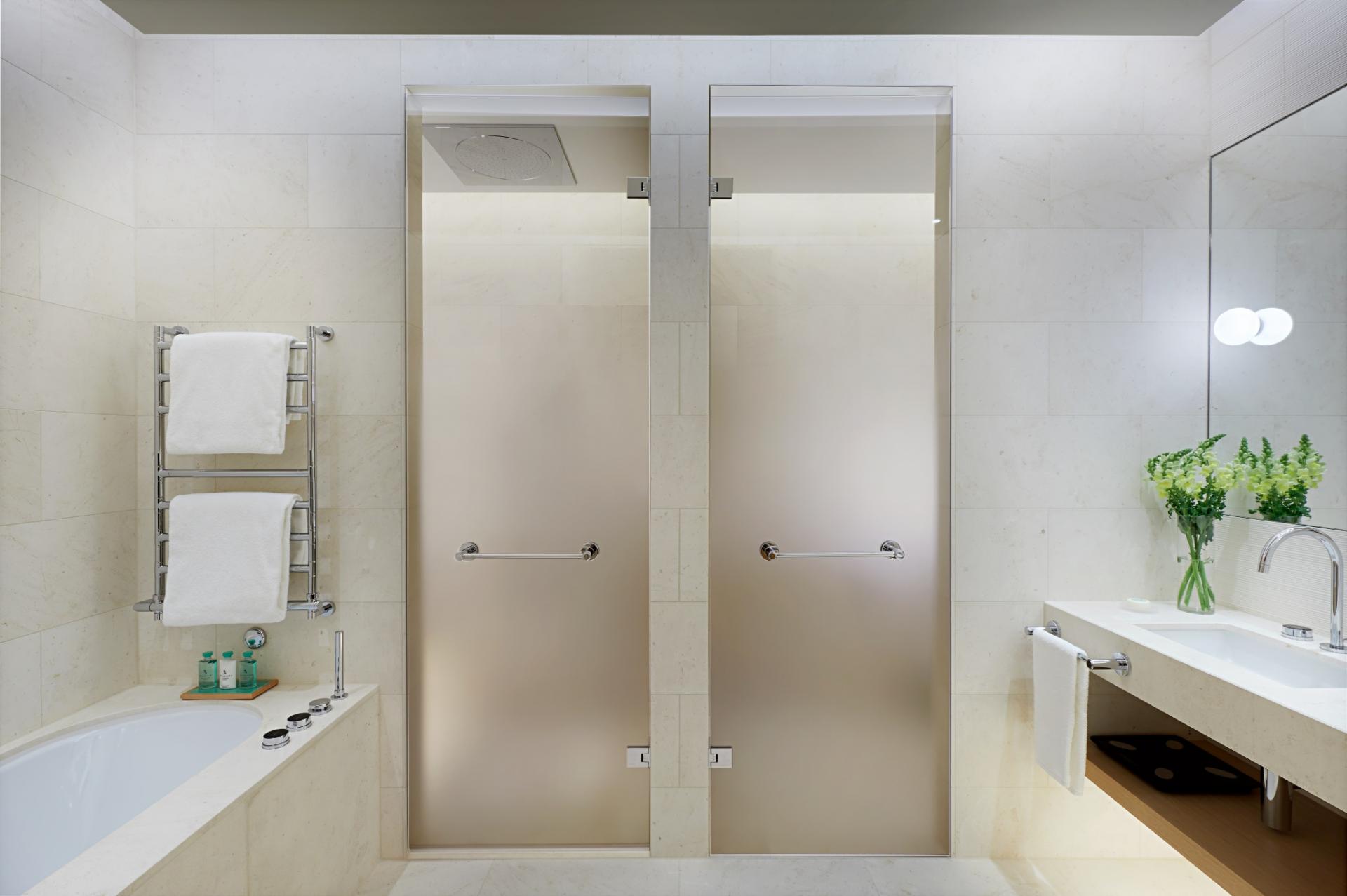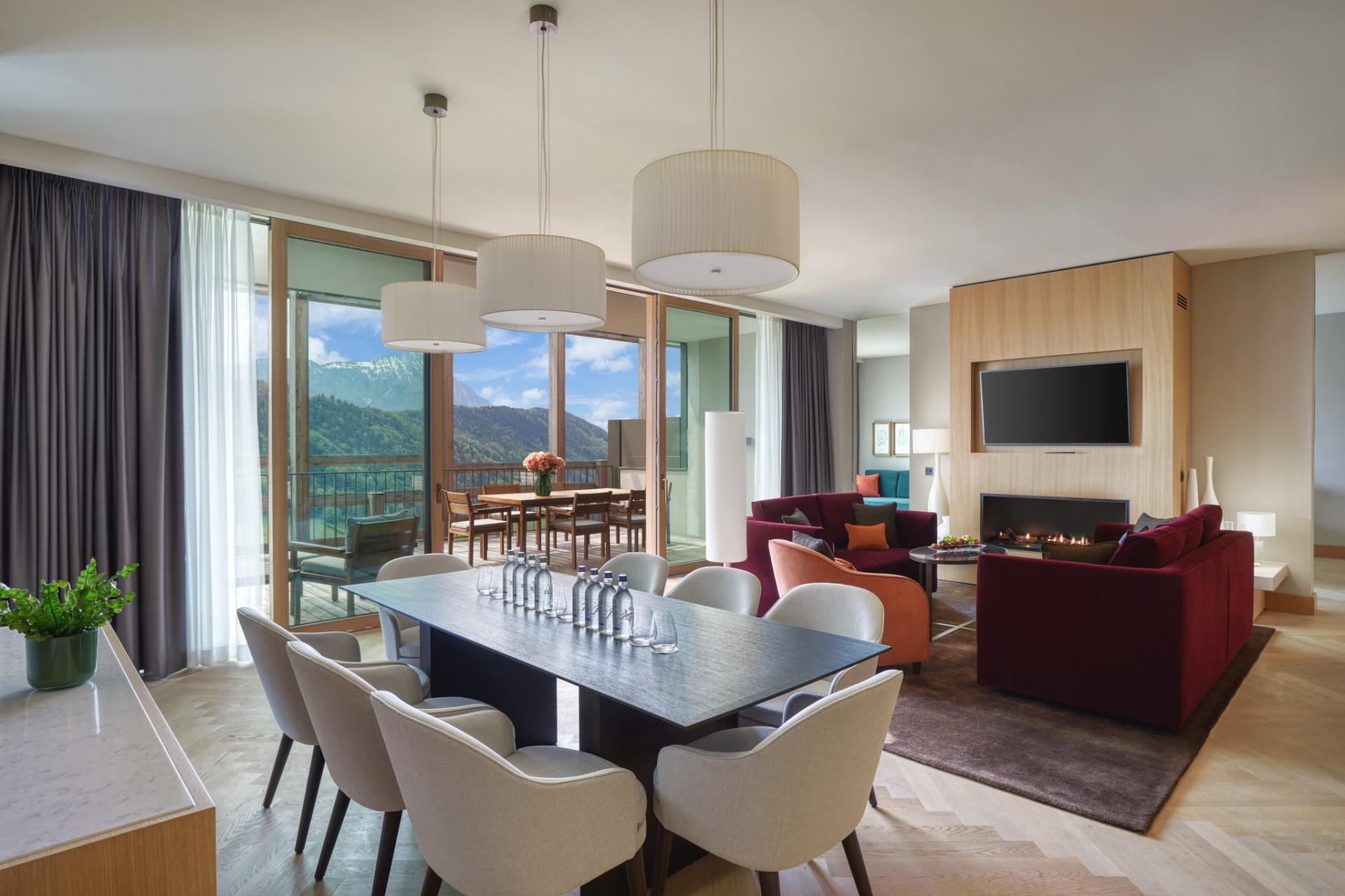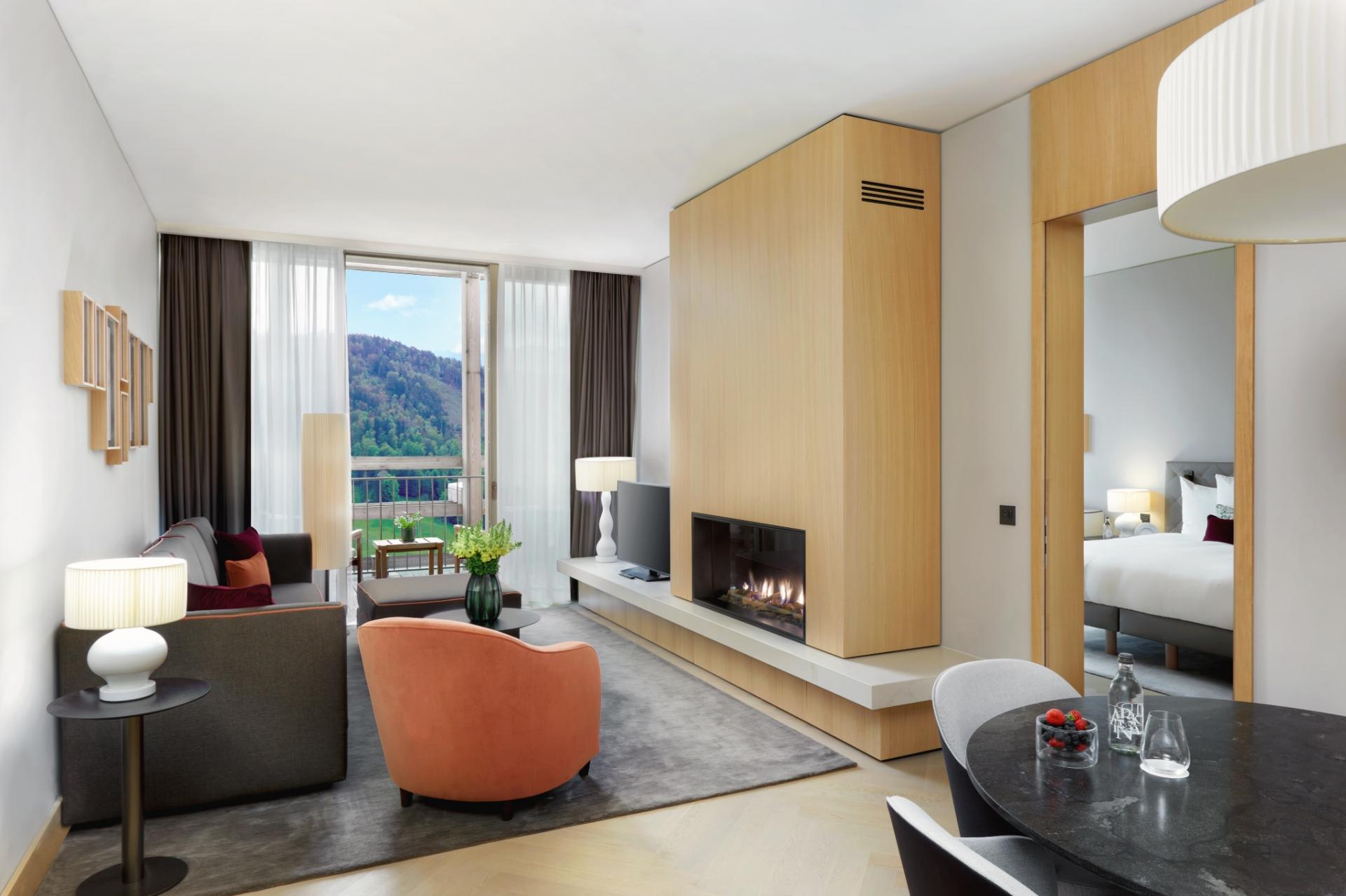 40 кв. м Номер з підлогою до стелі складається з спальні, яка об\'єднана ліжком king size або двома ліжками розміру близнюка, дивана і робочого столу, ванної кімнати зі скляною перегородкою, санвузлом і окремим тропічним душем. Кількість закруглених сонячних балконів (7 кв. м). Вид альпійський. Доступний номер і дитяче ліжко. Розміщення: 2 дорослих і 1 дитина.