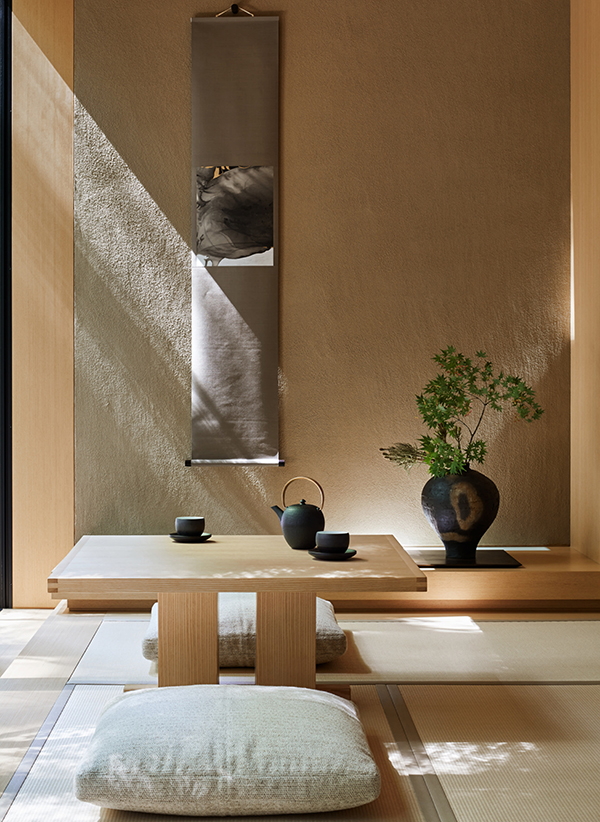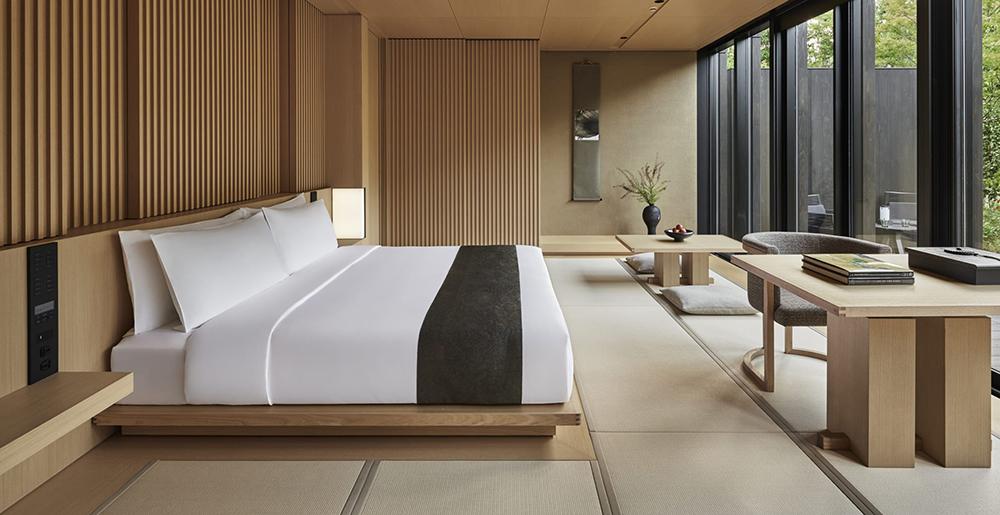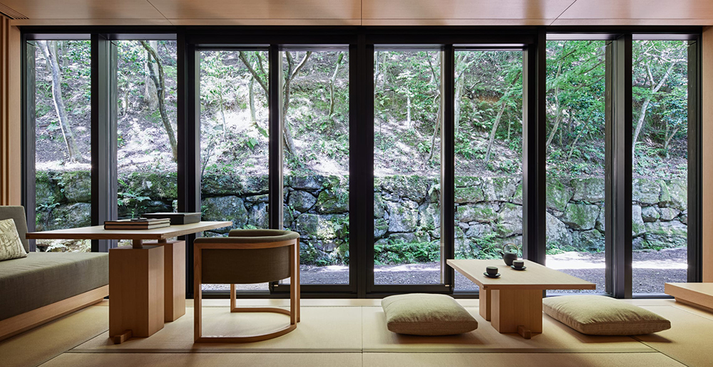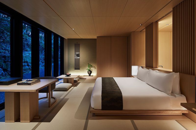 Кімнати та павільйони Aman Kyoto – це сучасна данина поваги традиційному японському рьокану, вражаюче мінімалістична за своєю геометрією та вікном у захопливі природні краєвиди. Інтер'єри просторі та світлі, що дозволяє кожному простору існувати та дихати ландшафтом та історичними лісистими садами, що оточують, створюючи відчуття спокою.