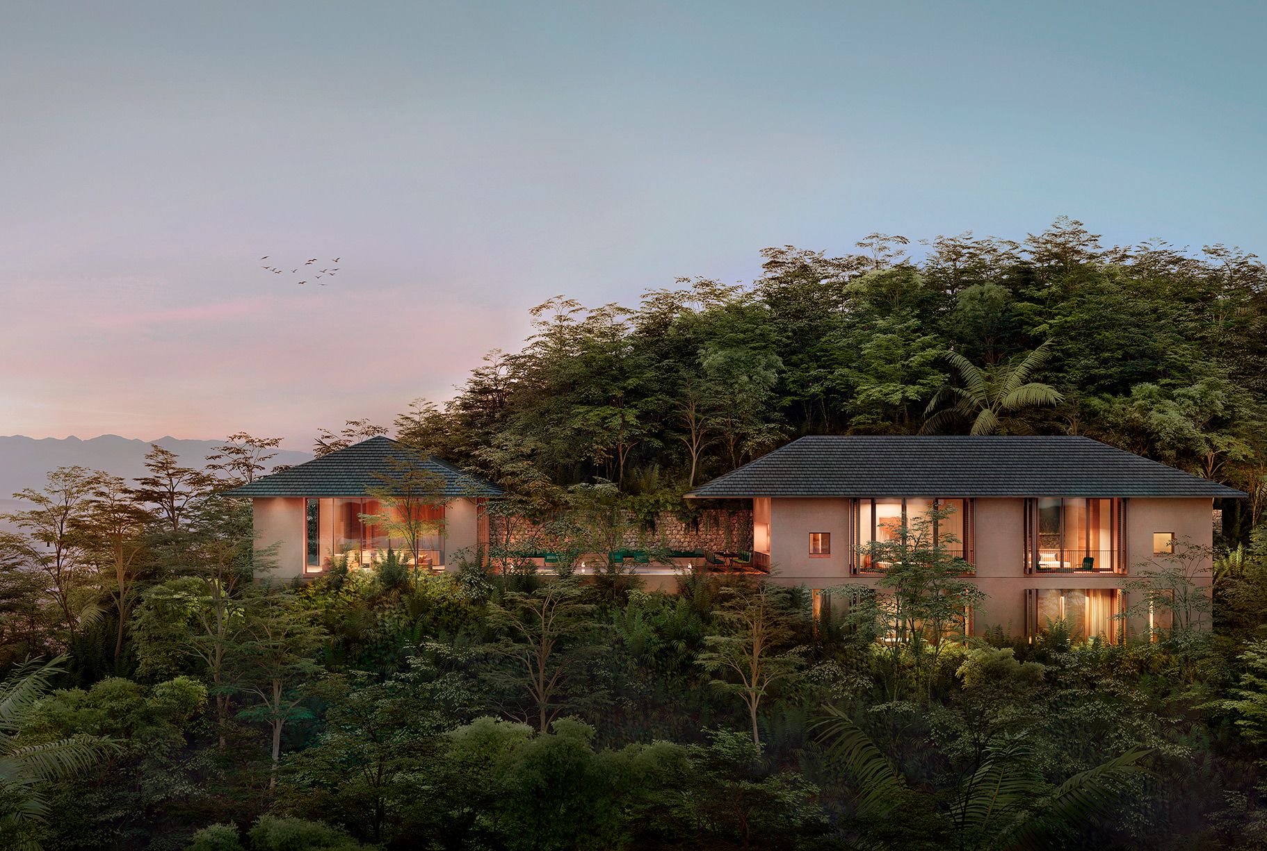 ОдинТільки Мандарина складається з 105 розкішних окремих будинків на деревах (Трєхауси) і вілл на сколідері з видом на океан. Кожен такий будинок або вілла має закриті зони і відкриті тераси з захоплюючими видами на узбережжі Тихого океану, власним басейном і санвузлом, а також панорамними вікнами з підлоги до стелі і скляних стін, через які припливають через дерева і водонепроникний сонячний світло.