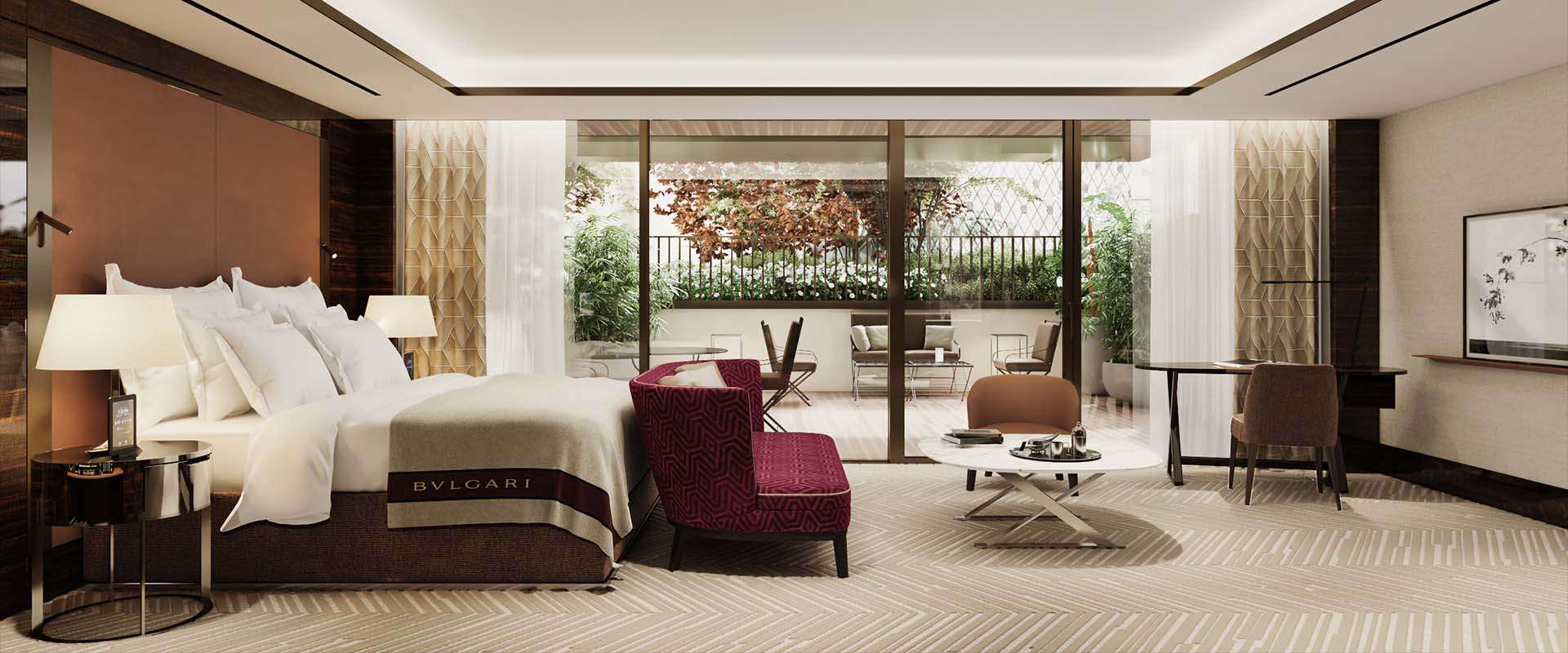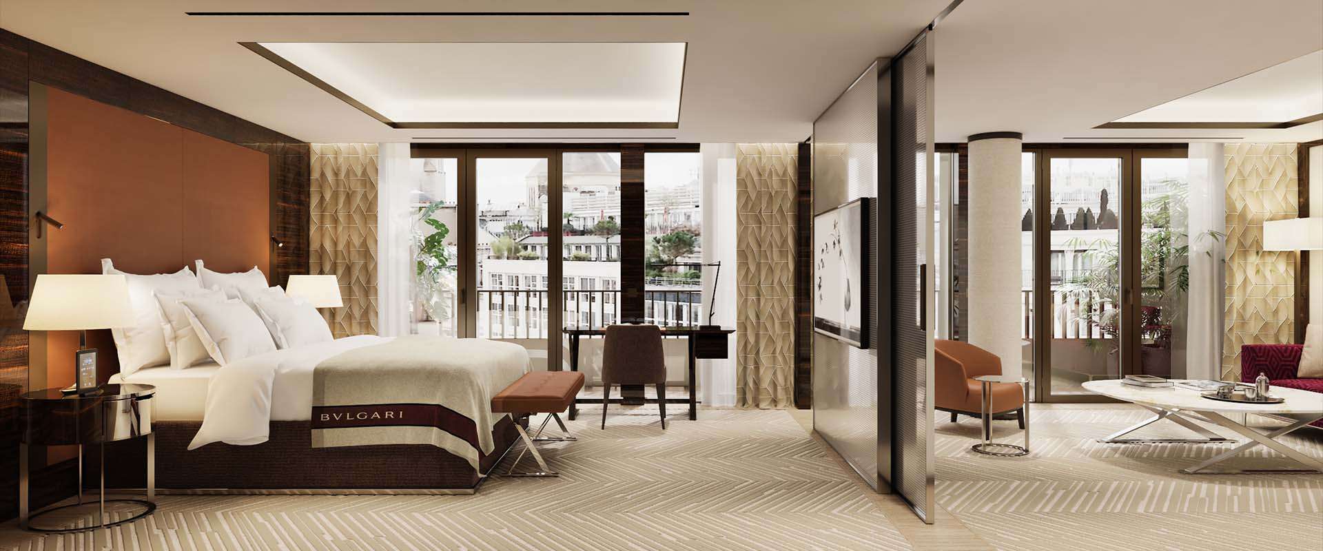 Як і всі готелі та курорти Bvlgari, Bvlgari Hotel Paris спроектований італійською архітектурною студією Antonio Citterio Patricia Viel. У готелі є бар з видом на сад, lounge-зона з плюшевими кріслами, масивним каміном і стелею, інспірованим клатчем-мінодьєром Bvlgari, дворівневий спа-центр площею 1300 квадратних метрів з 25-метровим басейном, фітнес-зал з приватною студією Gymnasium, розробленими для Bvlgari спортсменкою та моделлю Лі Маллінз.