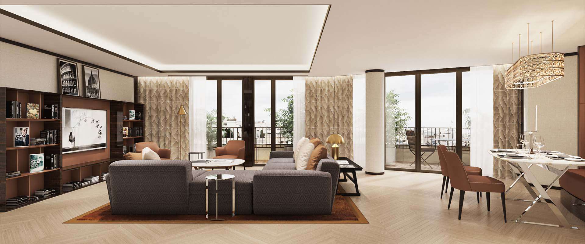 Представницькі люкси площею 91-95 кв.м з терасою або балконом мають гардеробні, обідню зону, вітальню та гостьову ванну кімнату. Надаються послуги дворецького.
