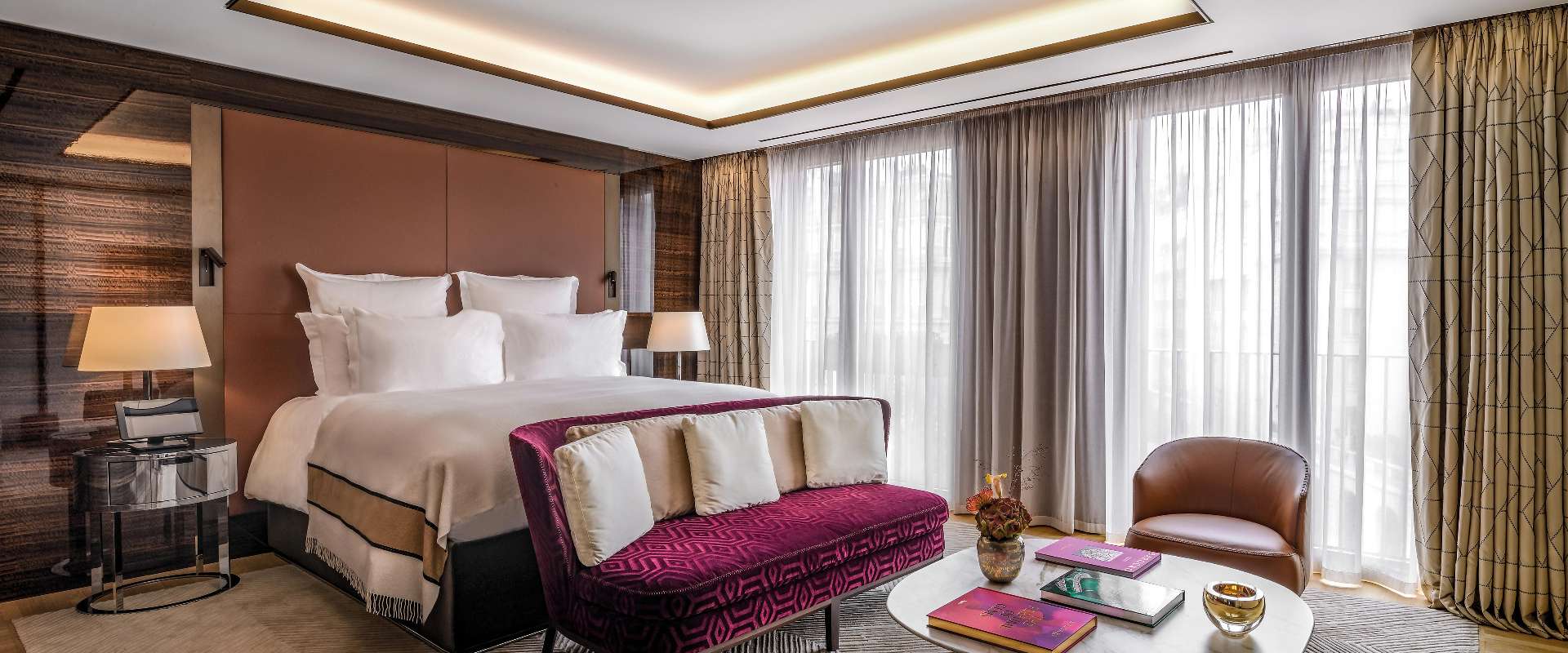 Люкс площею 123 кв.м має ліжко кінг-сайз, хаммам, гардеробну та вітальню. З вікон відкривається краєвид на Ейфелеву вежу.