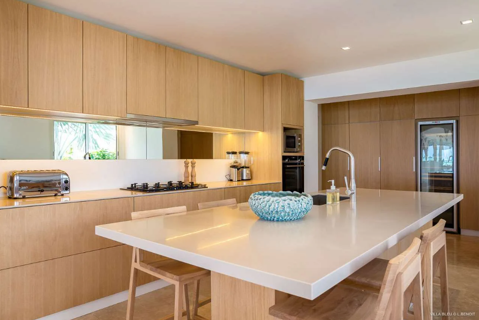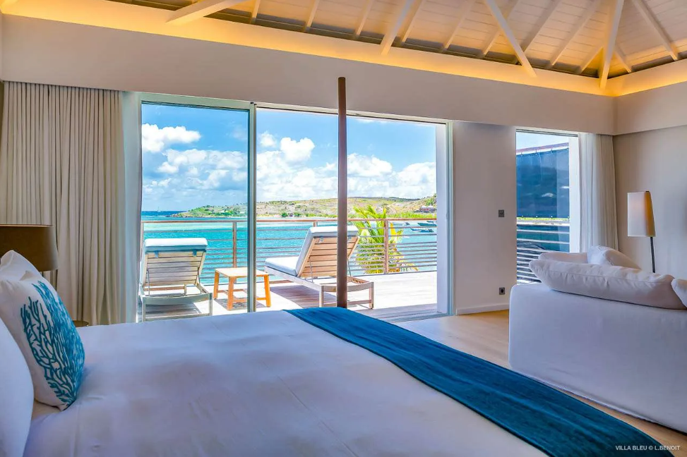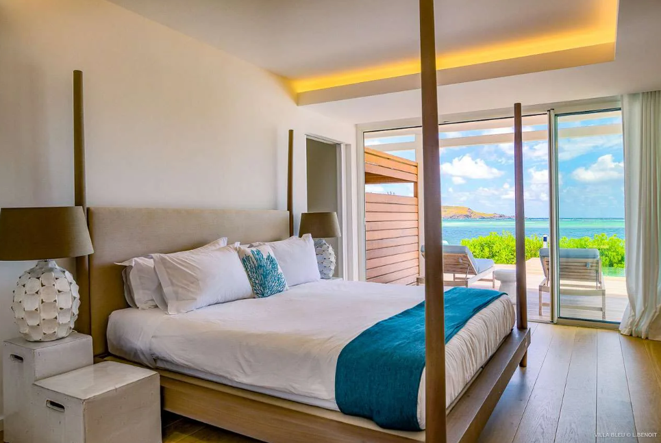 Шість спалень вілли Aqua – це розкішні сьюти, кожен із власною ванною кімнатою. Два з них - майстер-сьюти, розташовані на верхньому рівні, з королівськими ліжками, гардеробними, балконами з видом на море, душем-дощем та ванною. На основному рівні - чотири гостьові спальні; дві мають краєвиди на океан, дві - на сад. У всіх спальнях кондиціонер, особисті тераси, затишний стиль із використанням натурального дерева та м'яких відтінків. Центр будинку - велика вітальня з комфортними диванами, великий обідній стіл, кухня-гурме з сучасним обладнанням, а також допоміжна кухня-prep-kitchen з холодильником та винною шафою.