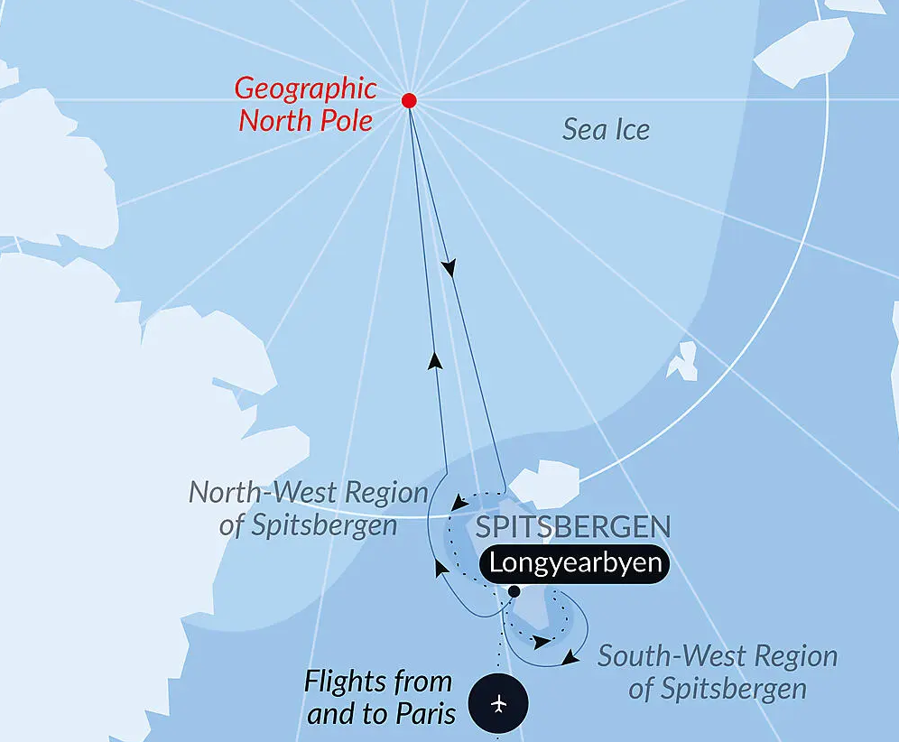 Розширте межі навігації та вирушайте у плавання до 90 градусів північної широти! На борту «Ле Коммандан Шарко», рідкісного судна, здатного впоратися з цим викликом, ви повільно просунетеся в серце крижаних полів у пошуках географічного Північного полюса. З Лонгйіра ви попрямуєте на північ, щоб пливти по водах на краю Землі, до ландшафтів, що постійно змінюються в залежності від льоду та гри світла. По дорозі назад східна Гренландія відкриє вам свої величні фіорди, традиції інуїтів і, можливо, північне сяйво. Рідкісна одіссея, між крижаною тишею і незайманою величчю кордонів світу.